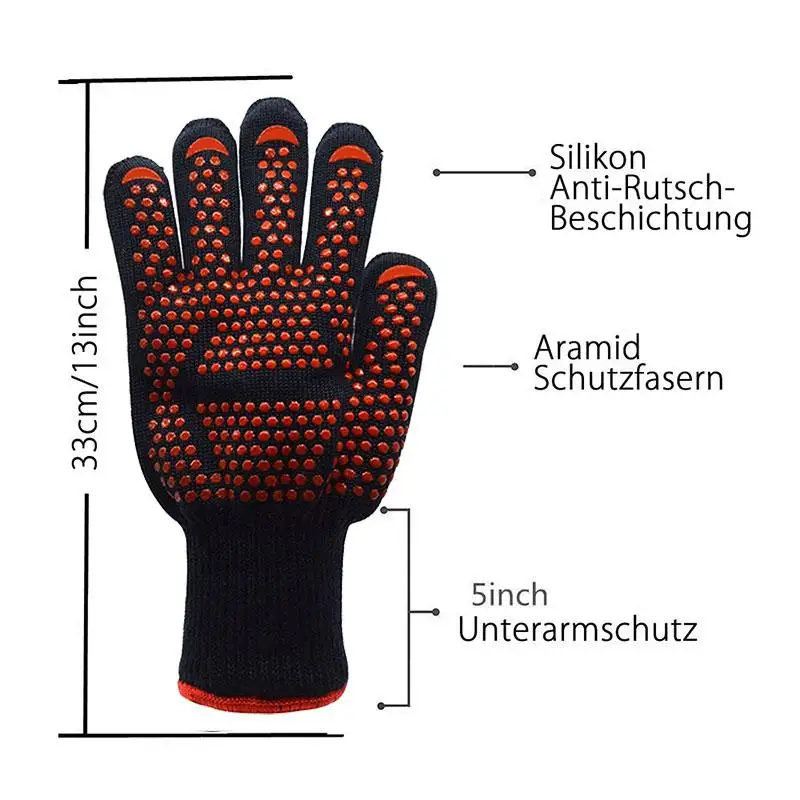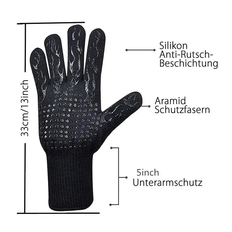 Premium Oven Grill Gloves are guaranteed to withstand extreme temperatures up to 932ºF (500ºC). A true innovation in heat protection for the oven, stove top, and outdoor grill. Nomex and Kevlar fibers when they combined they slow the rise of temperatures when handling hot items. Perfect for grilling, smoking, cooking, baking, or handling super hot items in the kitchen and outdoors.