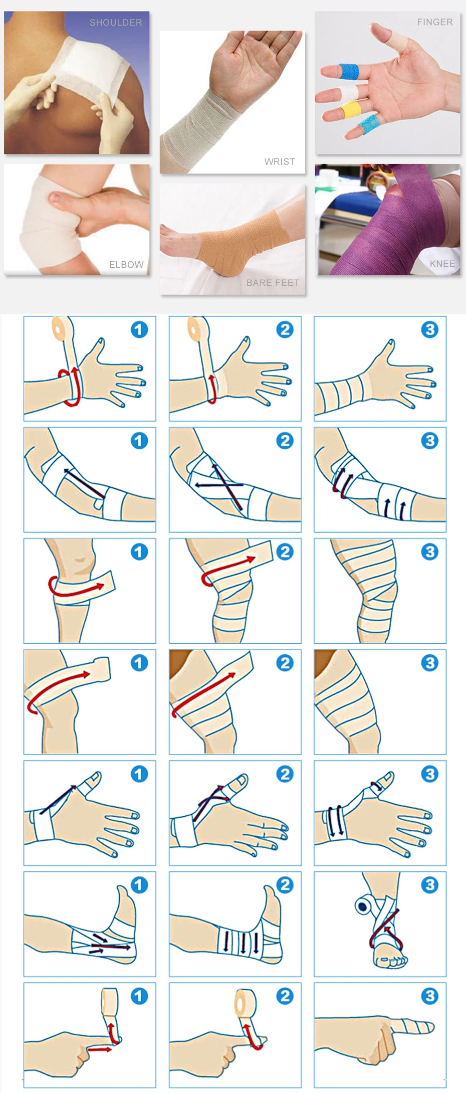 3.Permeability: After bandaging, skin can full contact with air ease of evaporation of sweat and moisture, high comfort.