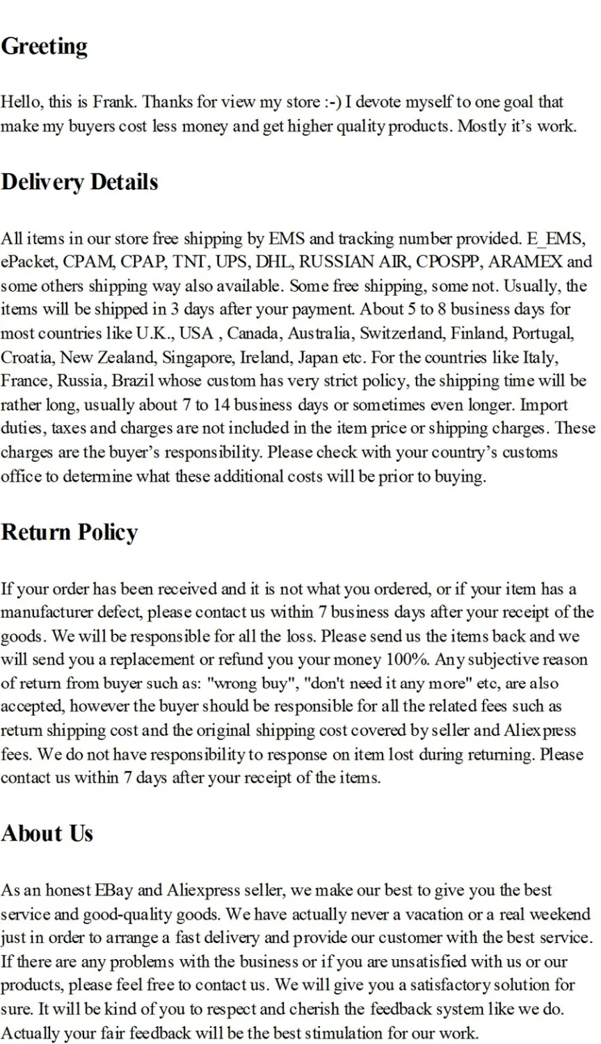 - Please contact me in message at first that if you have any disappoint in the deal. I will reply you as soon as possible (no more than 24 hours). I would like to do my best to satisfactory to you. It’s rude that leave a negative feedback or open dispute before contact the seller.