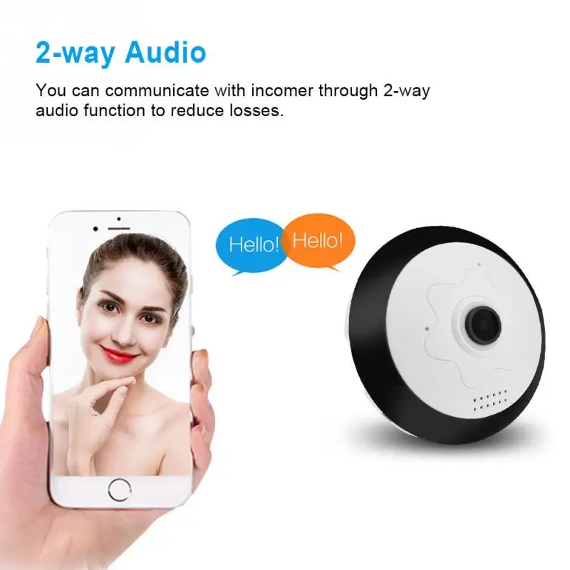 This fisheye ip camera adopts 360° viewing angle and 2 million pixels to give you a super clear and full vision to protect your house from all directions. Phone app control helps you control whole situation even when you are outdoors. And 2-way audio allows you to chat with incomer to reduce losses. Furthermore, maximum 64G TF card and cloud storage can store as many videos and pictures as possible to keep evidence.