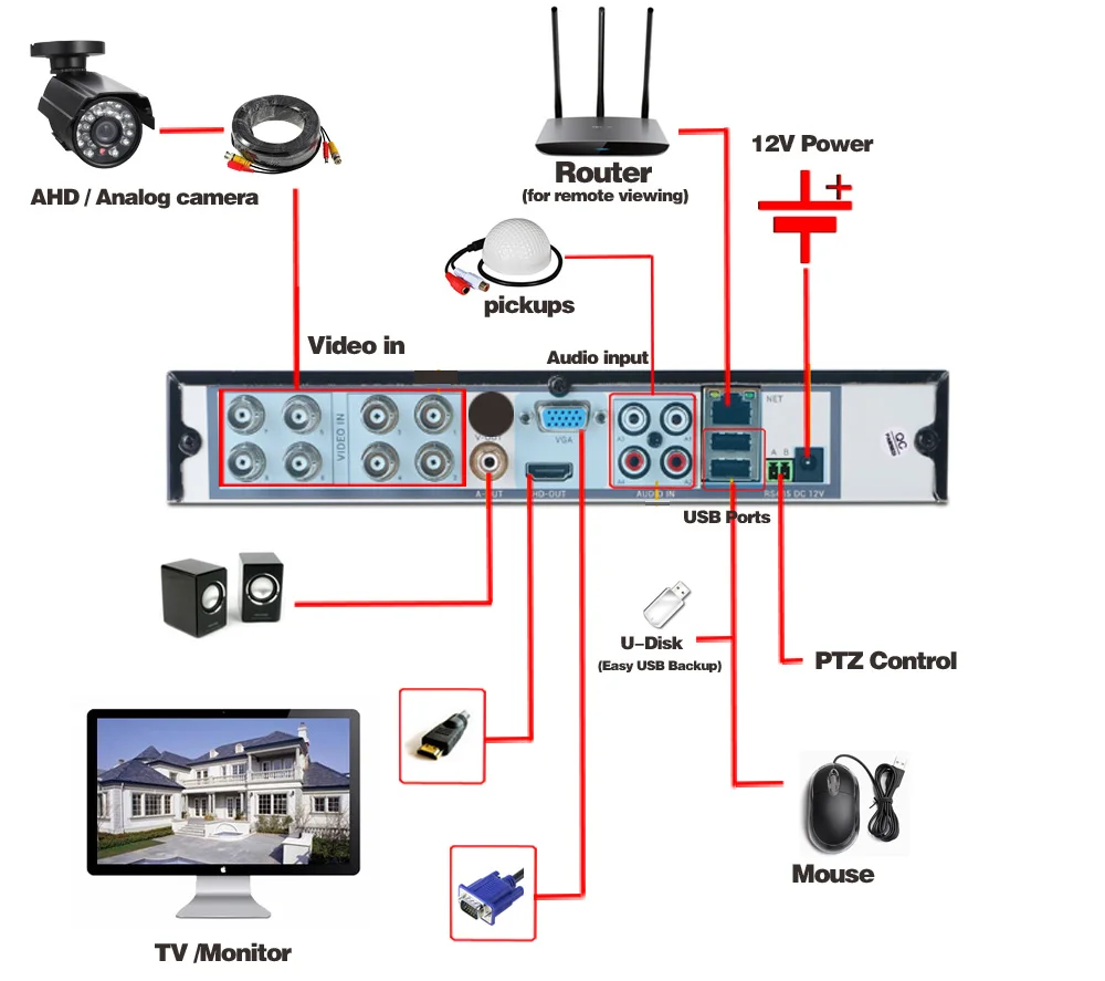 You can freely enjoy five connection modes with this one multi-function digital video recorder.AHD(Analog High Definition)is new advanced technology on home security with 5 recordering modes.for your option:Analog / Network / TVI / CVI / AHD+Network. You can get HD quality video in each mode.