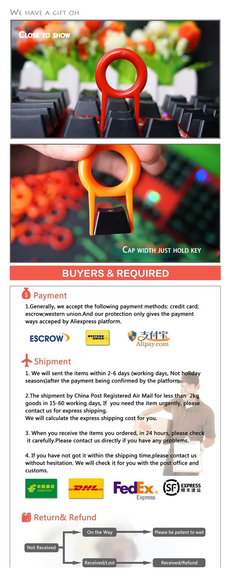 • If you do not want the product you’ve received you may request a refund but you must return the item at your expense and the item must be unused.