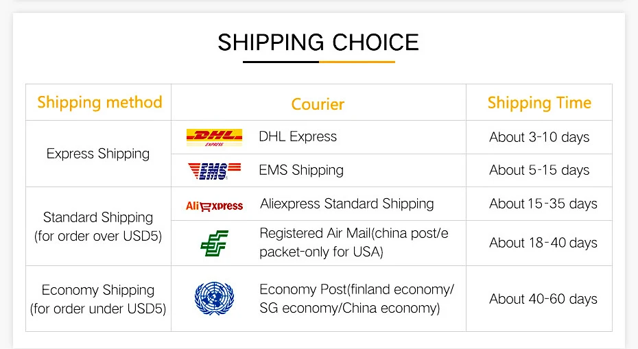Packages from our warehouse in China will be shipped by ePacket or EMS depending on the weight and size of the product. Packages shipped from our US warehouse are shipped through USPS.