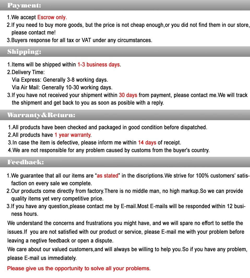 • If you did not receive the product within the guaranteed time( 45 days not including 2-5 day processing) you can request a refund or a reshipment.