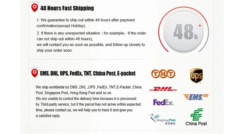 Packages from our warehouse in China will be shipped by ePacket or EMS depending on the weight and size of the product. Packages shipped from our US warehouse are shipped through USPS.