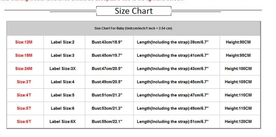 Size:6T=Newborn Label Size:6X Bust:55cm/22.1″ Length(Including the strap):51cm/6.7″ Height:120CM
