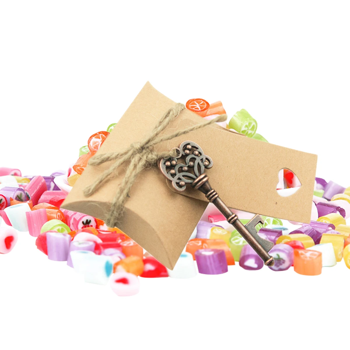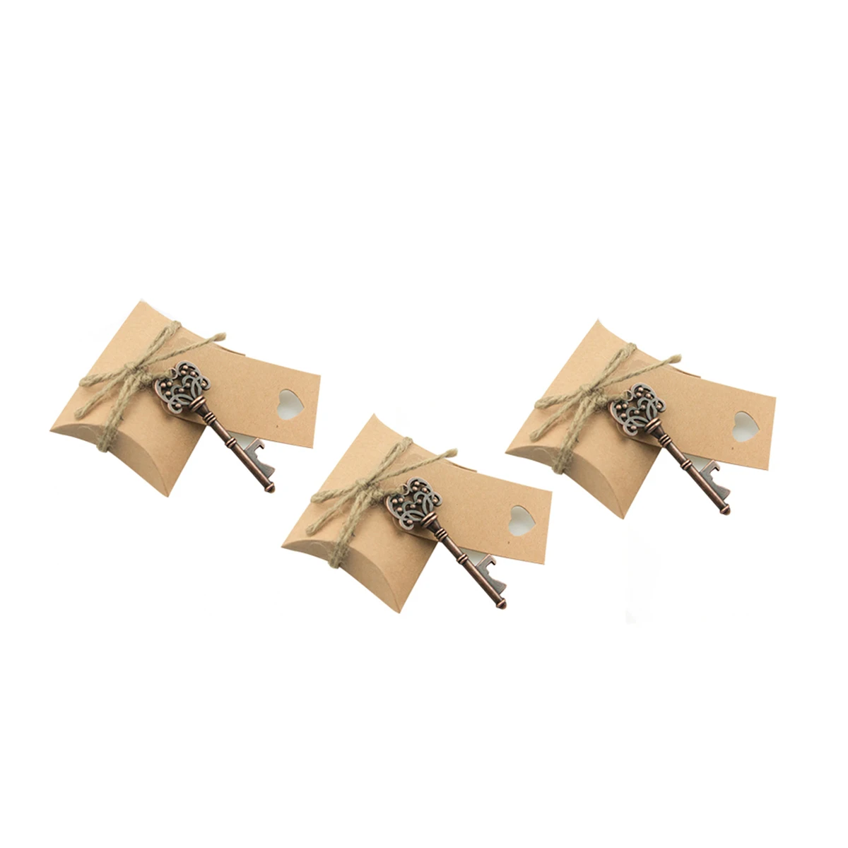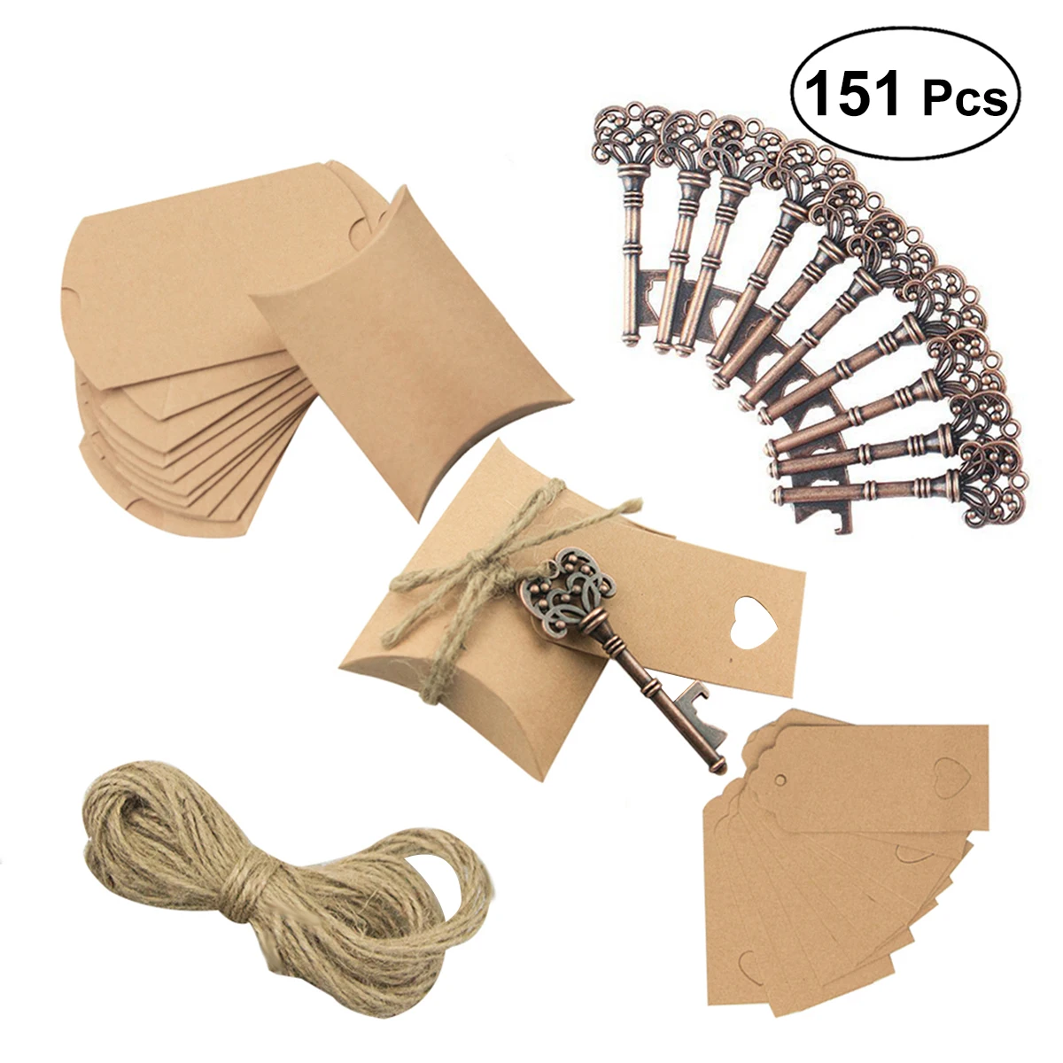 This is a set of 151pcs key shape bottle opener kit including 50pcs bottle openers, 50pcs candy boxes, 50pcs back cards and 1pc 10m hemp string. It is a nice and practical little present as wine bottle opener or beer bottle opener. You will finish one bottle opener kit on your own by connecting the bottle opener, back card and candy box together with a section of hemp string. This retro DIY bottle opener will be a special party favor on your wedding or any regular party. Also, you can tie the bottle opener to your key chain as portable opener for daily use.