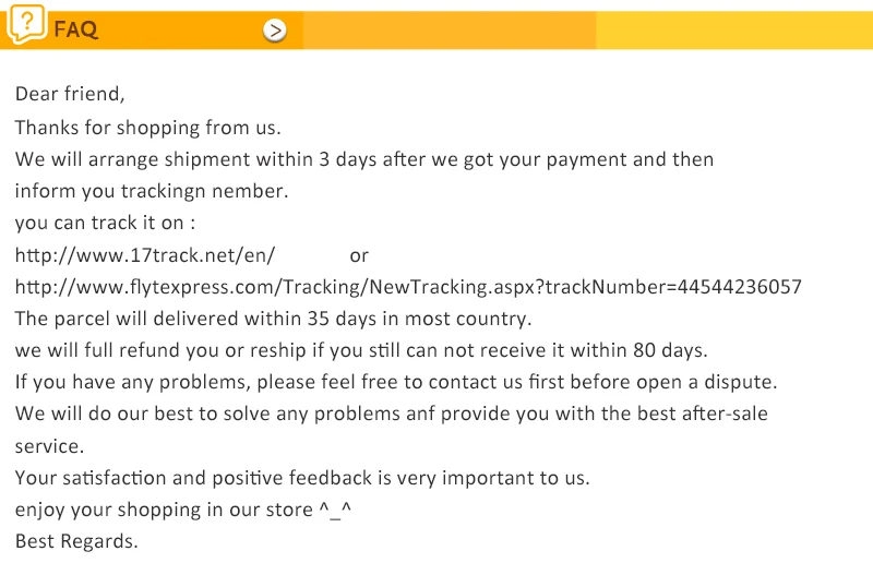 • If you did not receive the product within the guaranteed time( 45 days not including 2-5 day processing) you can request a refund or a reshipment.