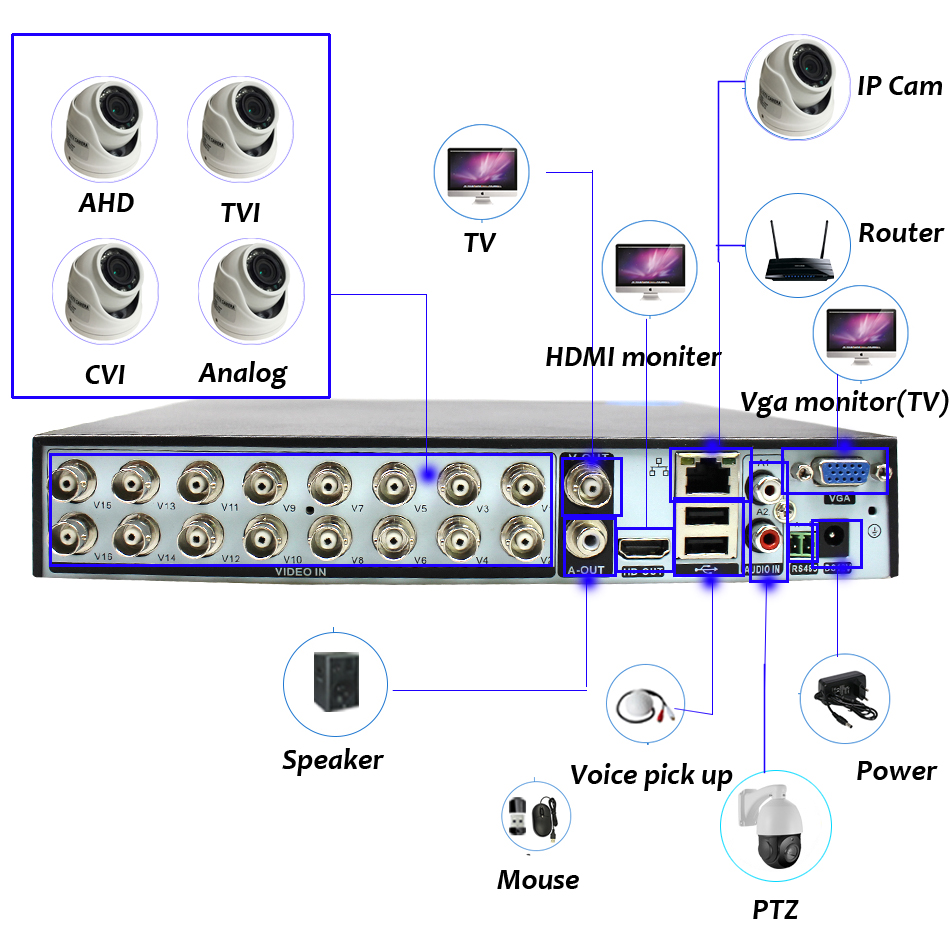 • Support 2 million pixels(1080P/AHD-H),1.3 million pixels(960P/AHD-M), 1 million(720P/AHD-M) pixels AHD/TVI/CVI Camera; Analog Camera(960H) and IP Cmera(2mp/3mp/5mp).