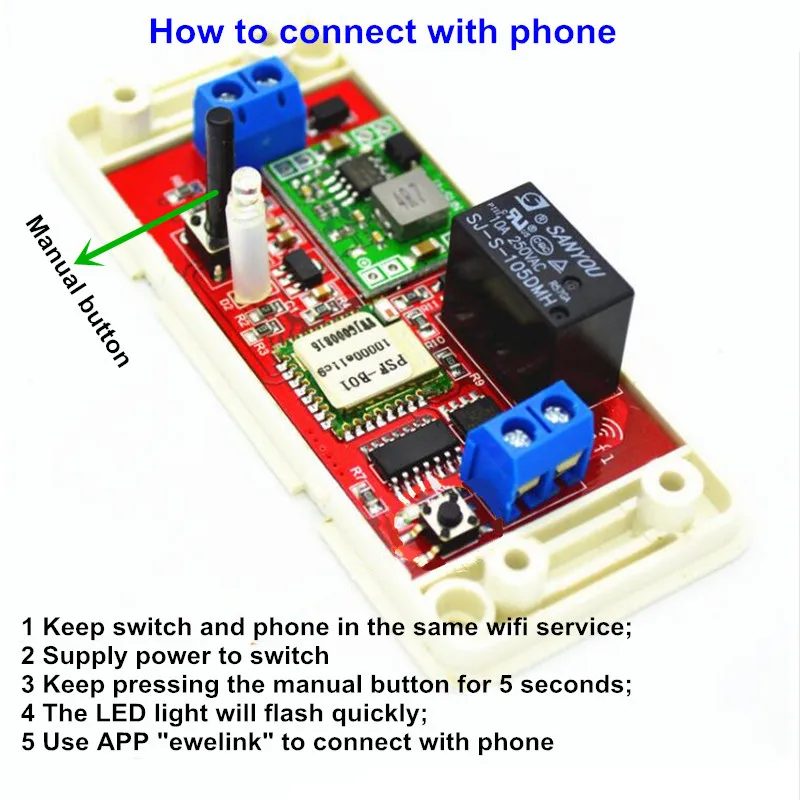 4 Keep pressing manual button for 5 seconds until you see the LED light flash quickly, then release it. Now add device on mobile phone by eWeLink APP according its introduction.