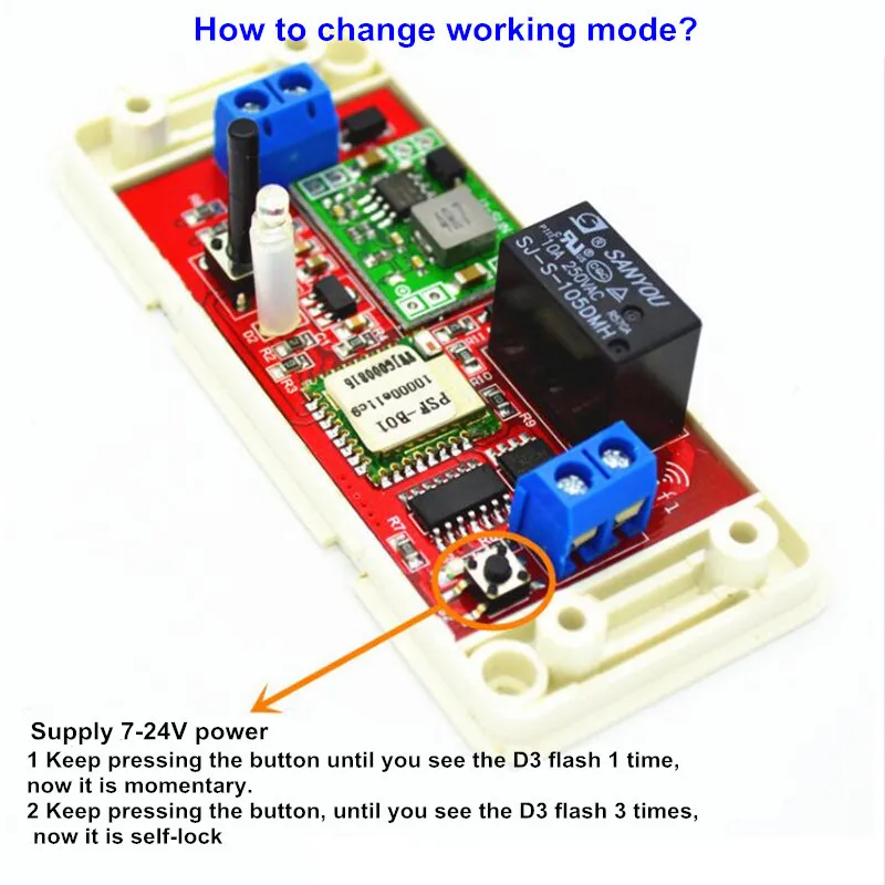 2: Keep pressing mode button until you see D3 flash 3 times, release button, now it is self-lock. (7-24V DC WIFI SWITCH)