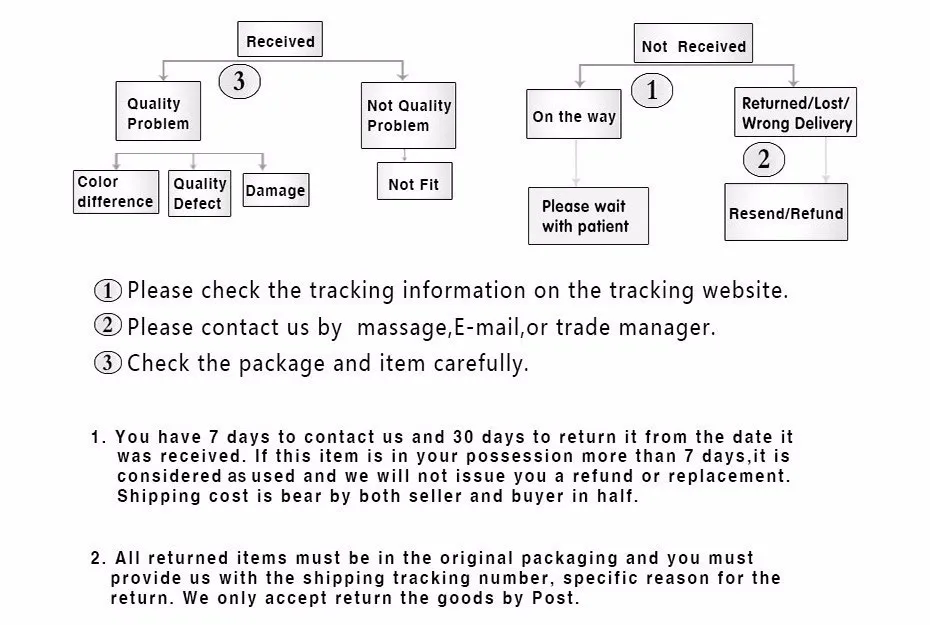 5.If you have not received your order after 30 days from payment, please contact us. We will trace your order and get back to you asap.