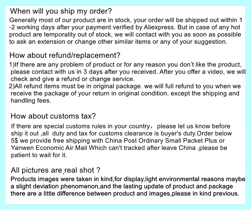 • If you did not receive the product within the guaranteed time( 45 days not including 2-5 day processing) you can request a refund or a reshipment.