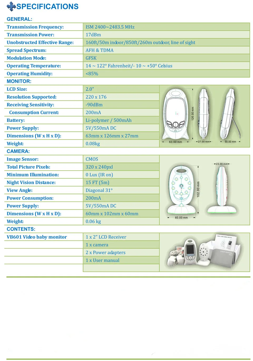 -Can be operated by rechargeable battery or AC 110-220V/DC adaptor 5V for monitor (included.)
