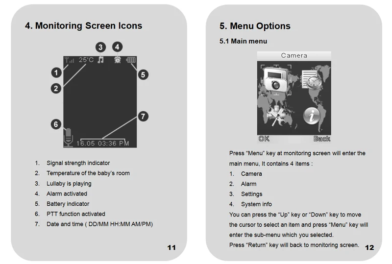 12,Two way audio between the camera and monitor, you can talk back to baby.