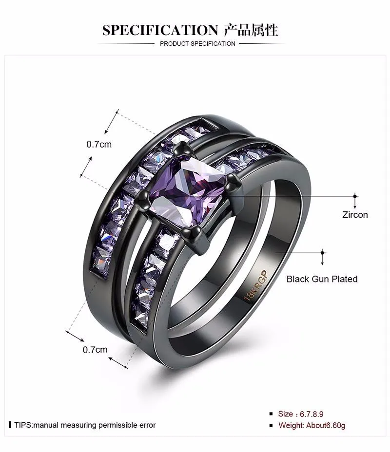 2 Pcs Black Trendy Wedding Ring AAA Purple Zircon Engagement Rings Jewelry For Women Or Men