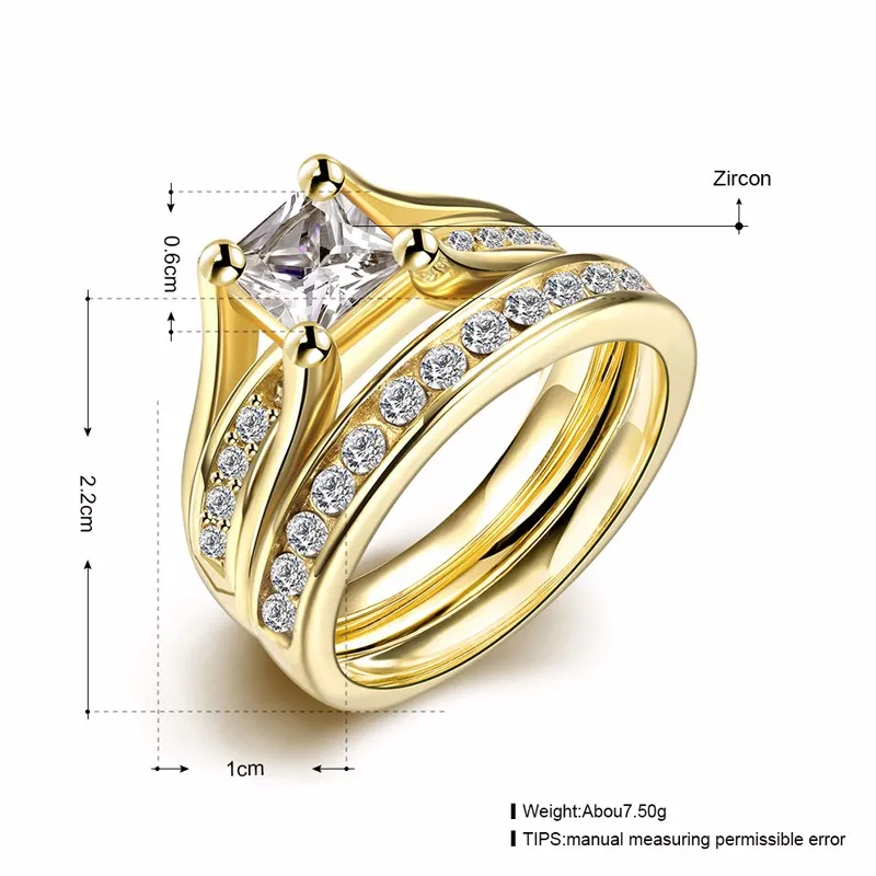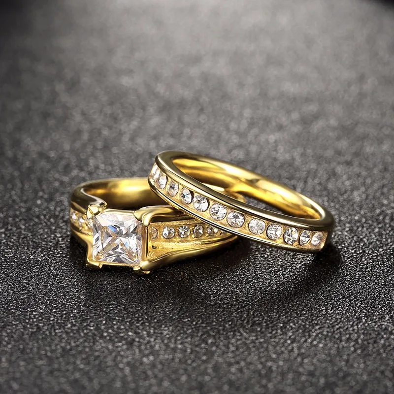 2 PCS Set Zircon 316L Stainless Steel Double Rings For Women Gold Color Crystal Female Engagement Wedding Bridal Finger Rings