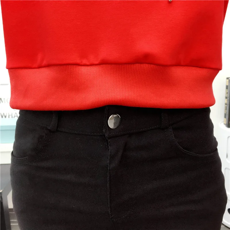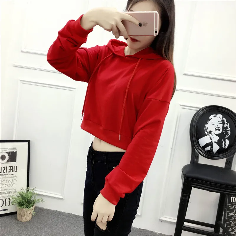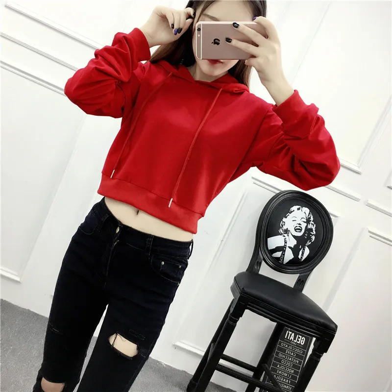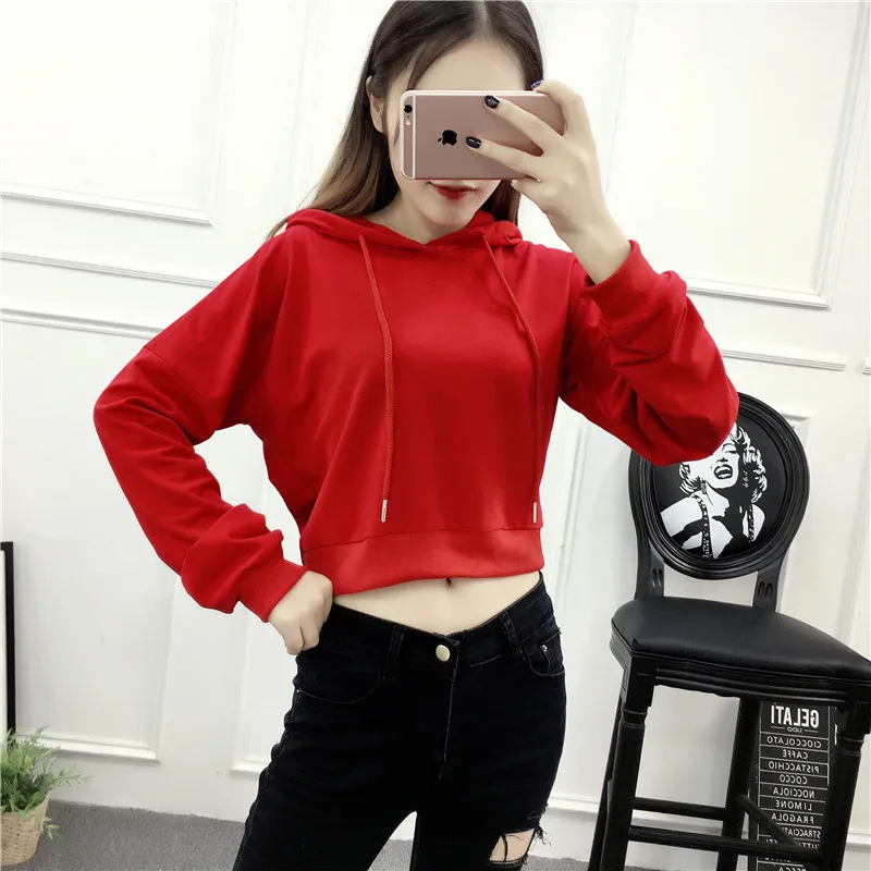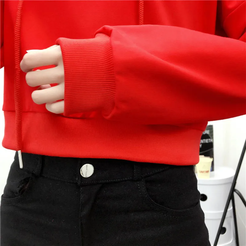 2017 Autumn Cropped Sweatshirt Women’s Kpop Casual Oversized Sporty Thin Hooded Pullovers Hoodie Ladies Hoody Red Black C77924A