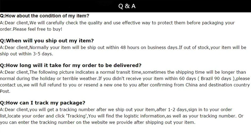• If you did not receive the product within the guaranteed time( 45 days not including 2-5 day processing) you can request a refund or a reshipment.