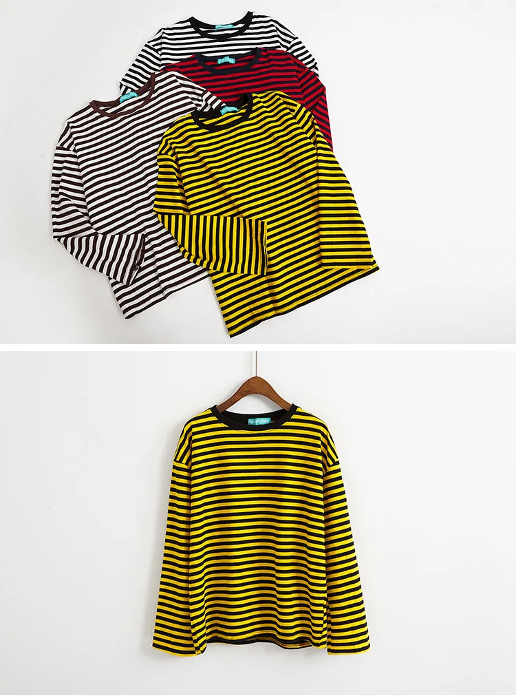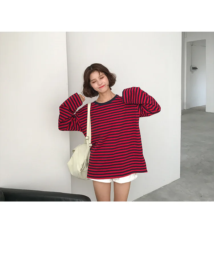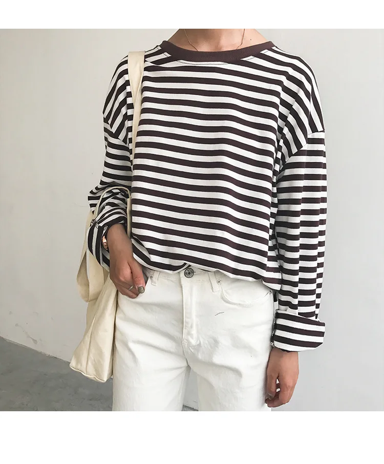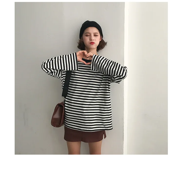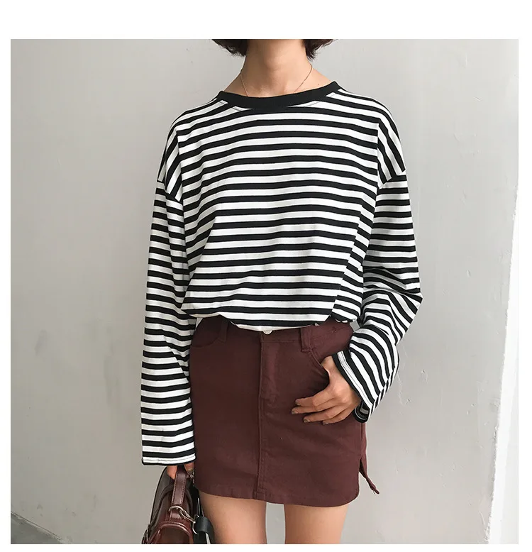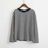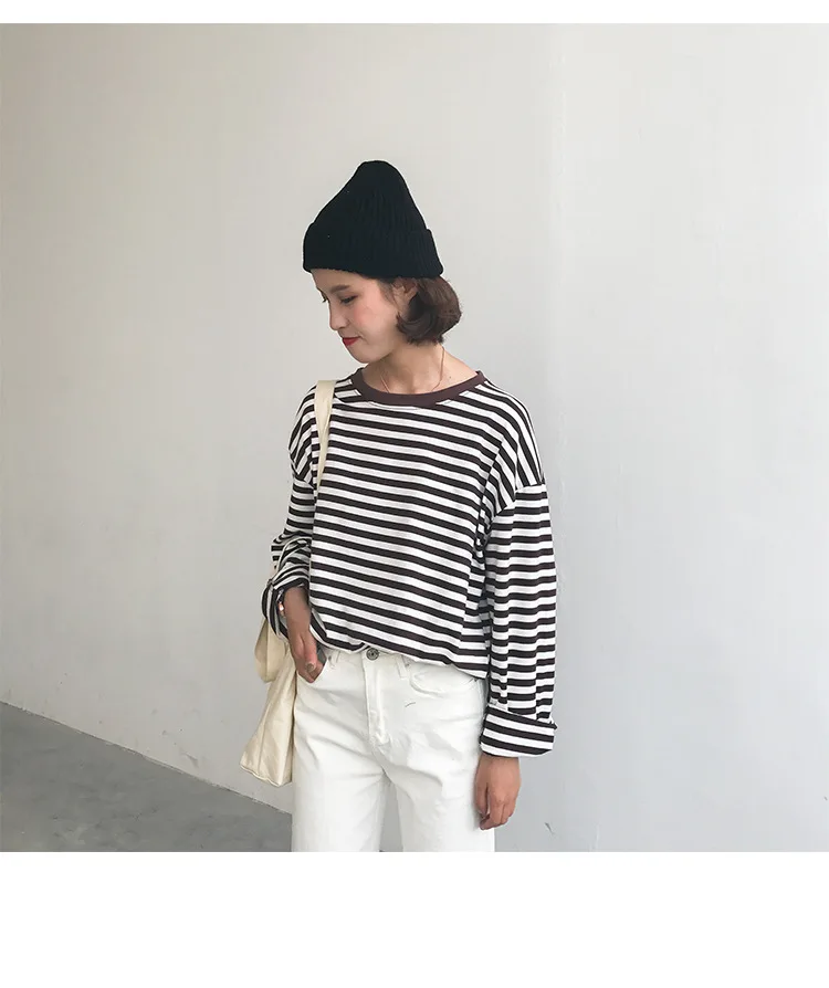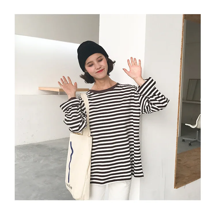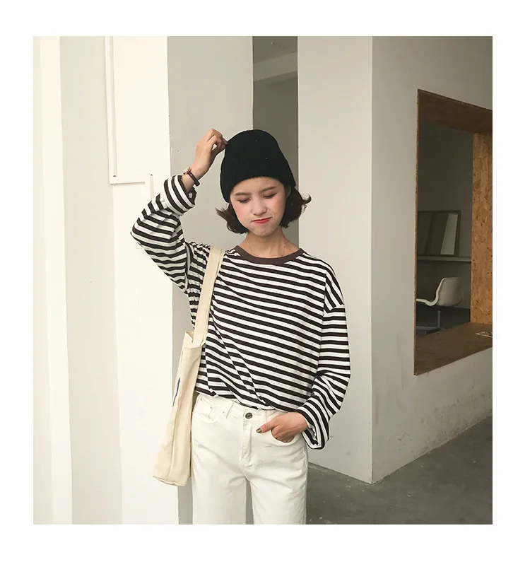 2017 New Vintage Fashion Basic Loose Casual Striped All Match Simple Long Sleeve Female T-shirts