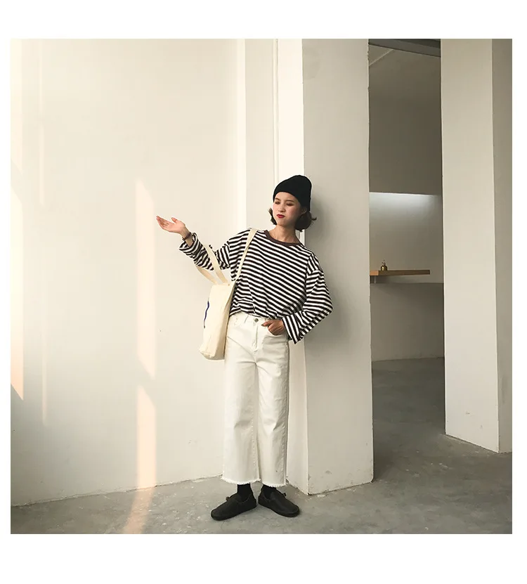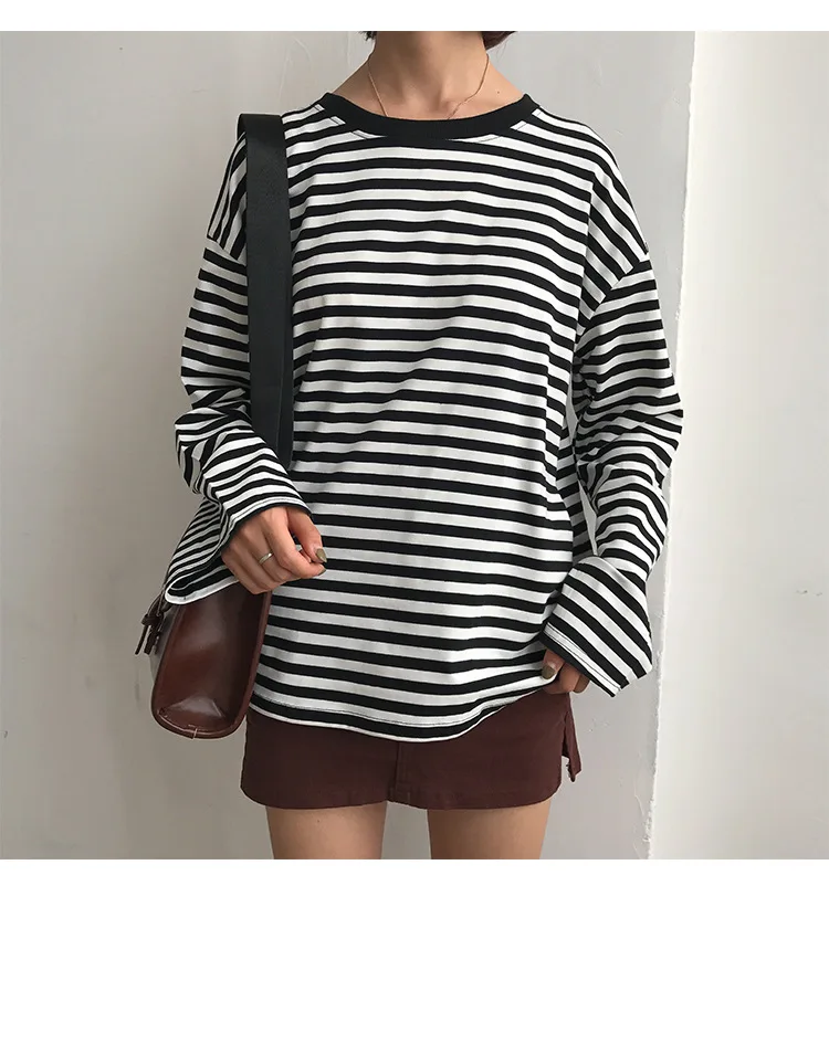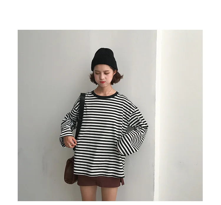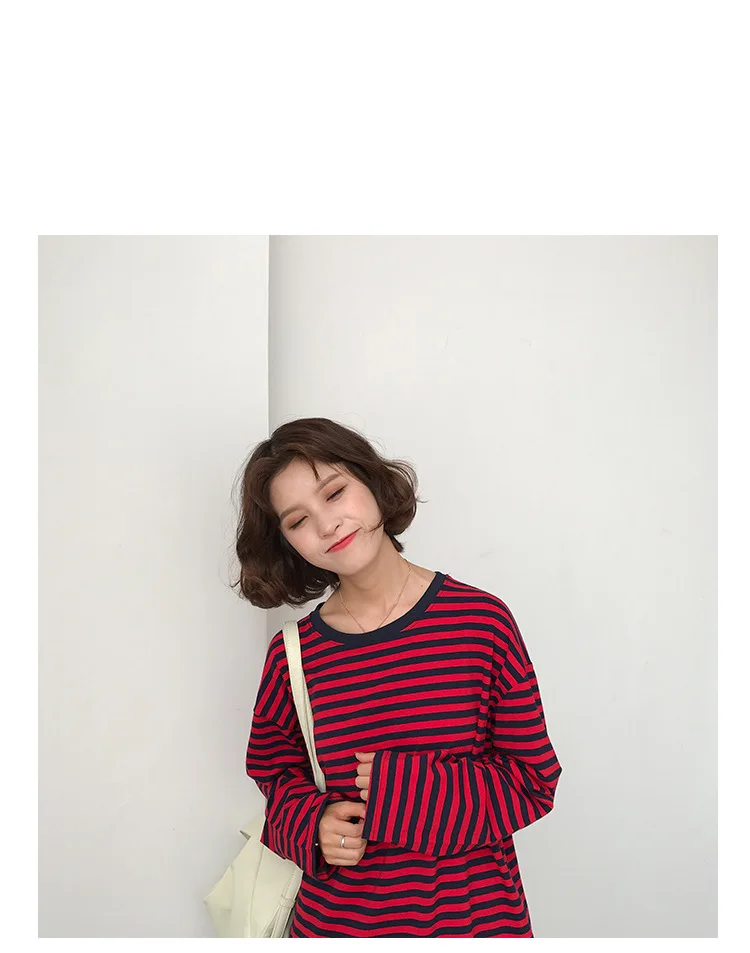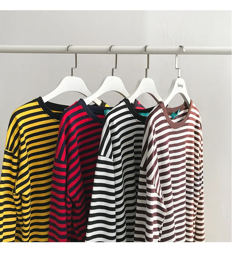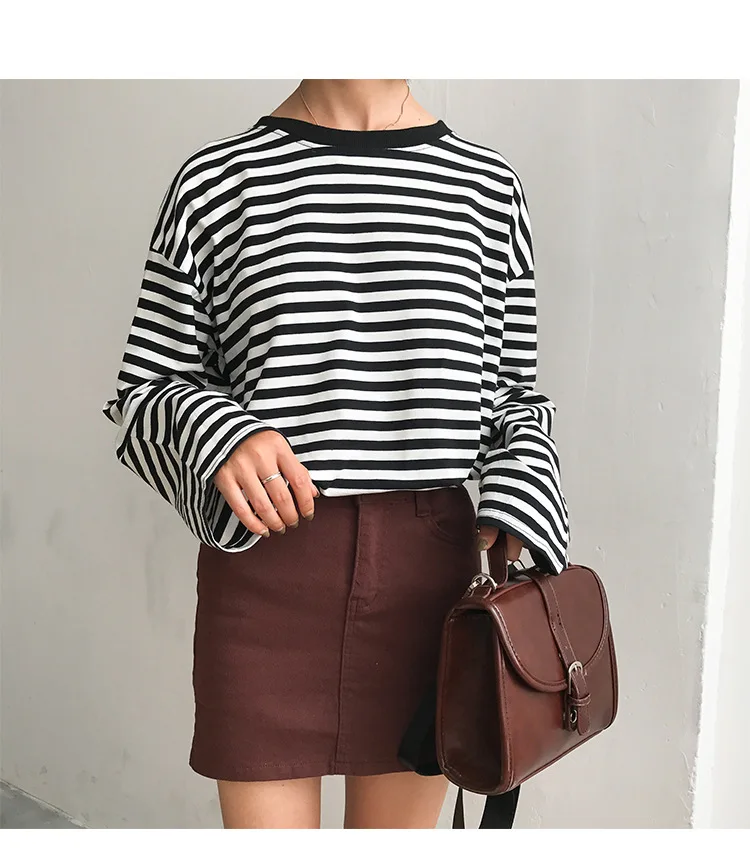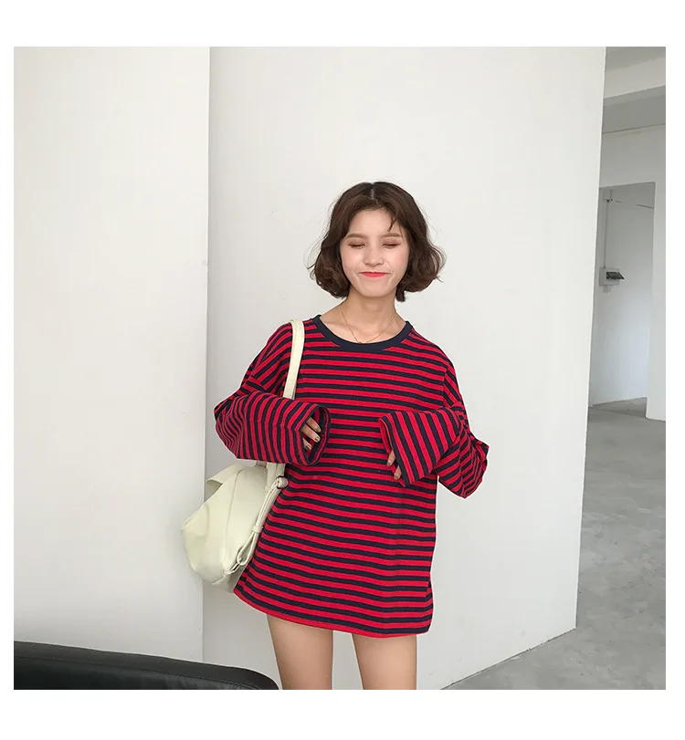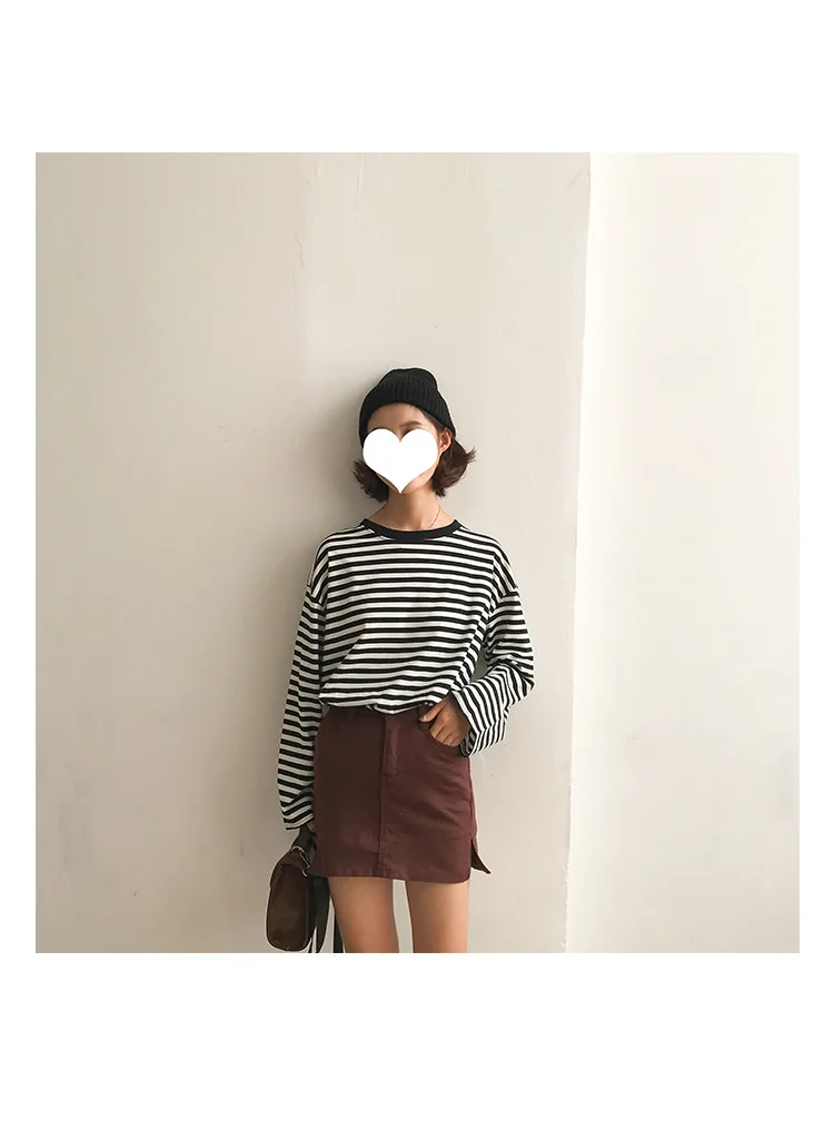 2017 New Vintage Fashion Basic Loose Casual Striped All Match Simple Long Sleeve Female T-shirts