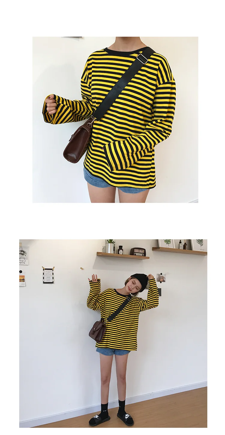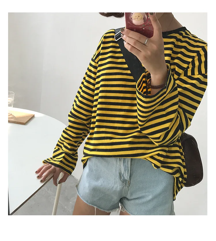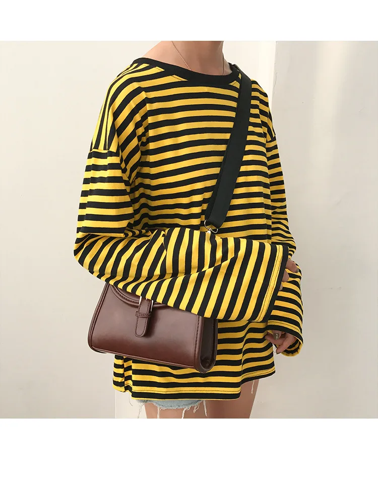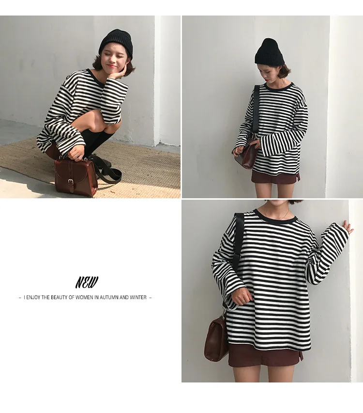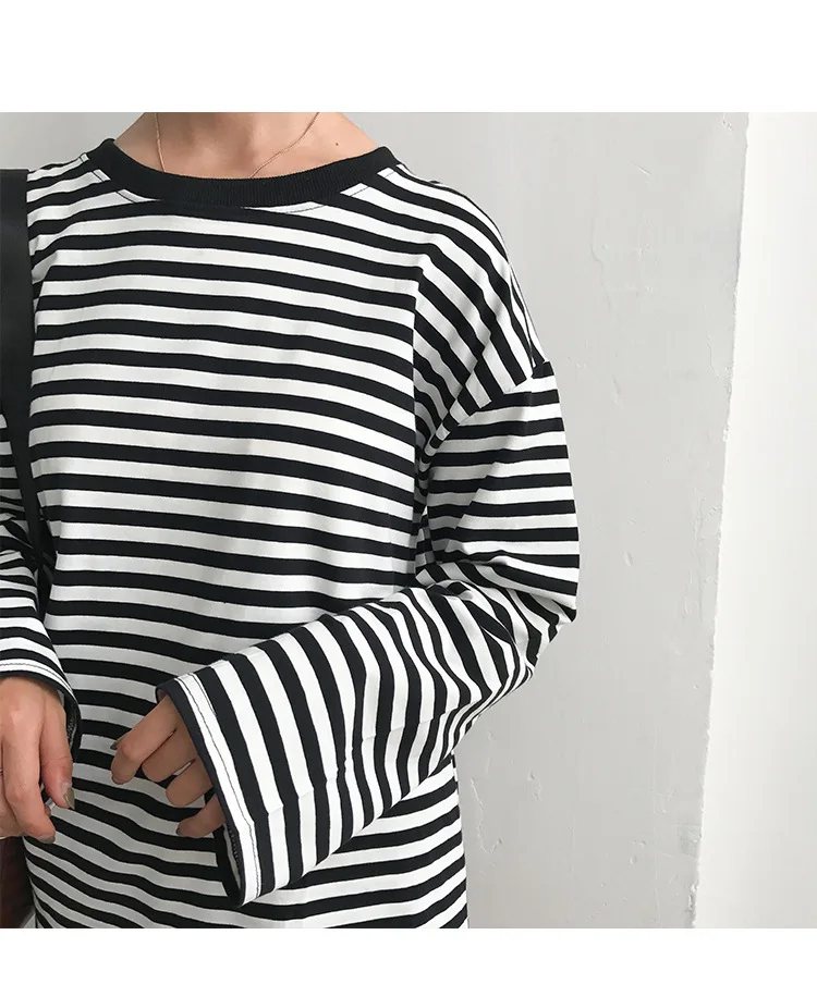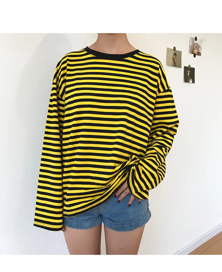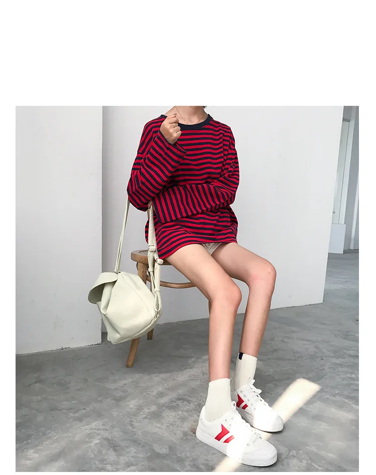 2017 New Vintage Fashion Basic Loose Casual Striped All Match Simple Long Sleeve Female T-shirts