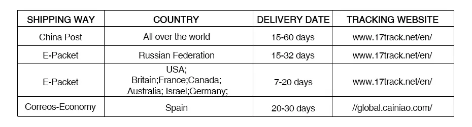 4.About the logistics We will arrange delivery as soon as possible after you pay Usually 2 to7 days Shipping time about 15-60 days From China According to different countries at different times During transport time will be prolonged activities of AliExpress We recommend shopping in advance.