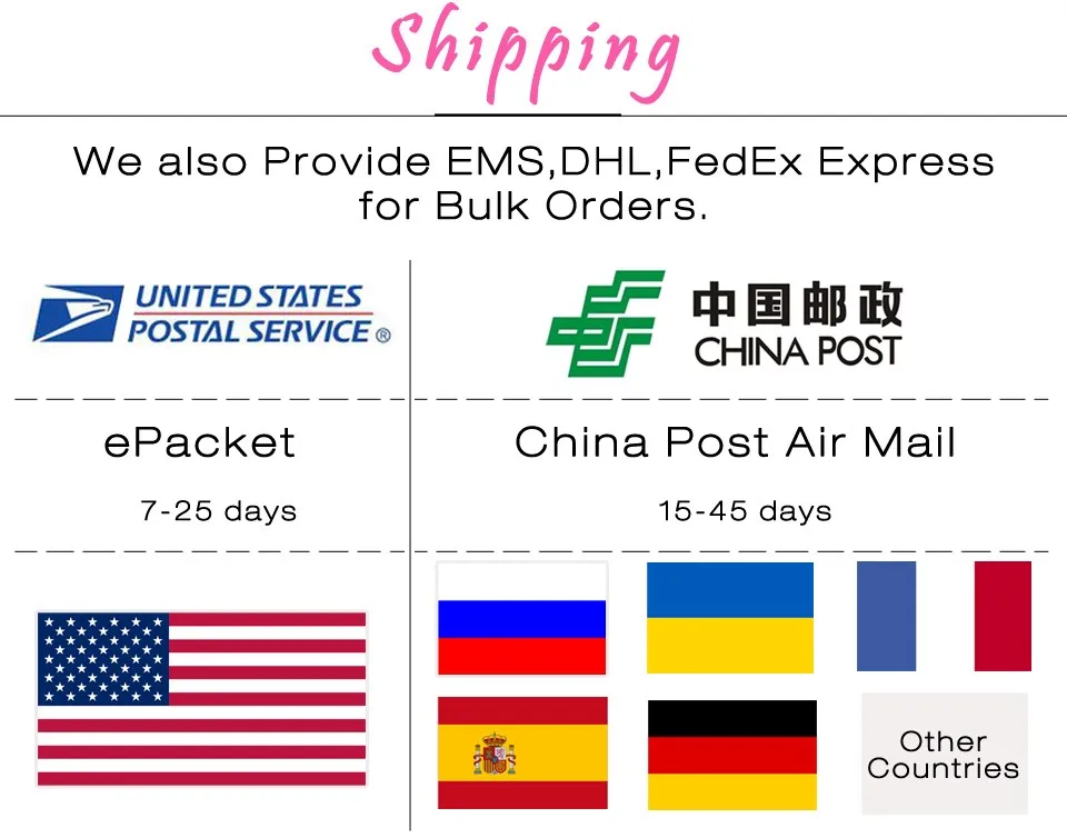Packages from our warehouse in China will be shipped by ePacket or EMS depending on the weight and size of the product. Packages shipped from our US warehouse are shipped through USPS.
