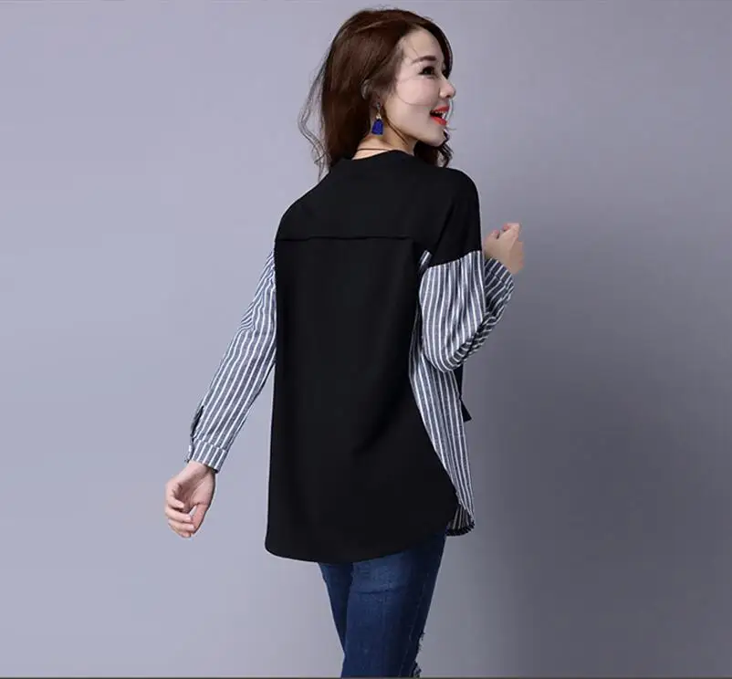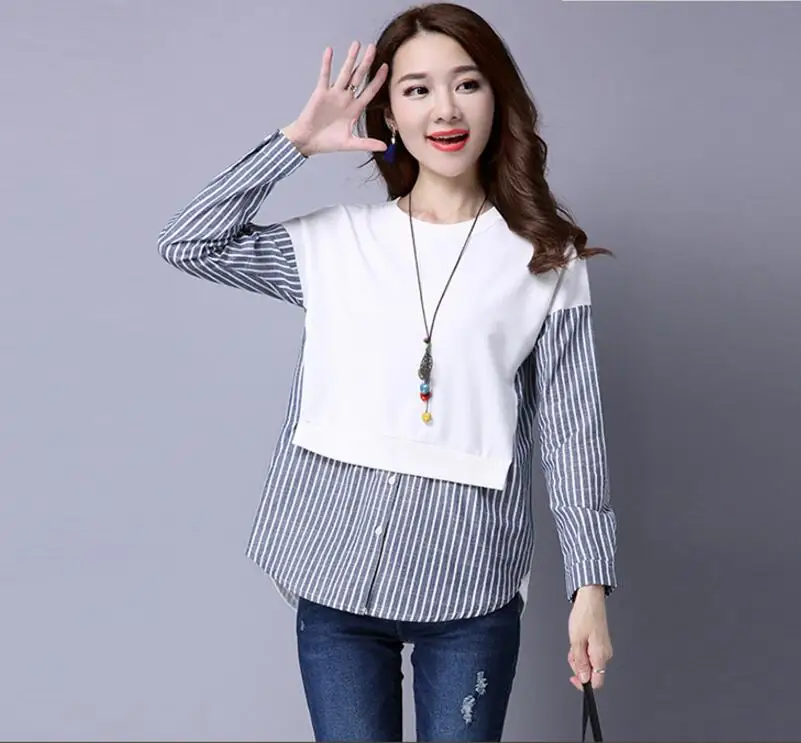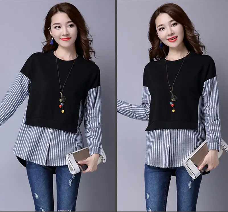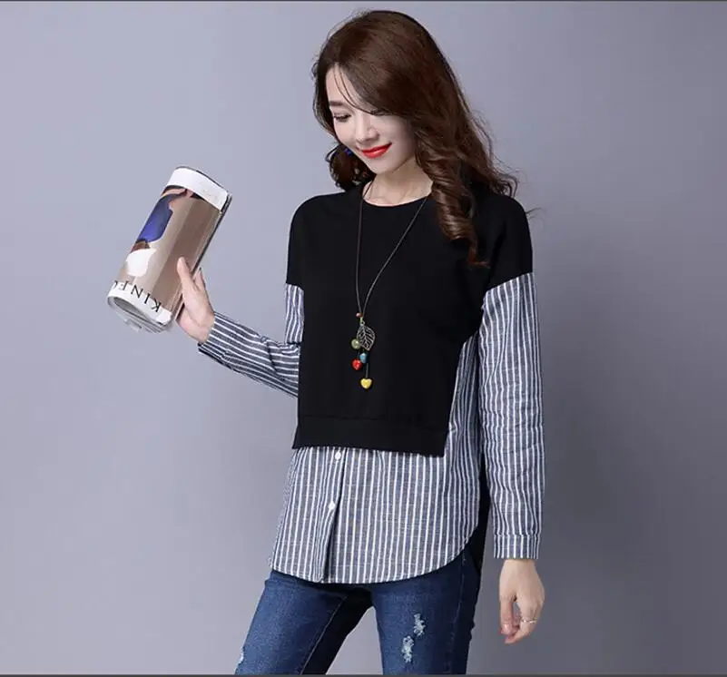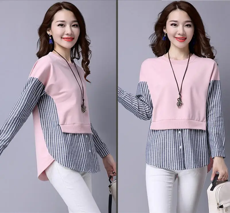 2018 Autumn Striped Patchwork Hoodies Women Clothing Long Sleeve Fake Two Pieces Pullovers Casual Tracksuit Female Sweatshirt
