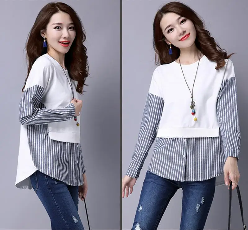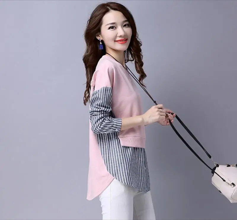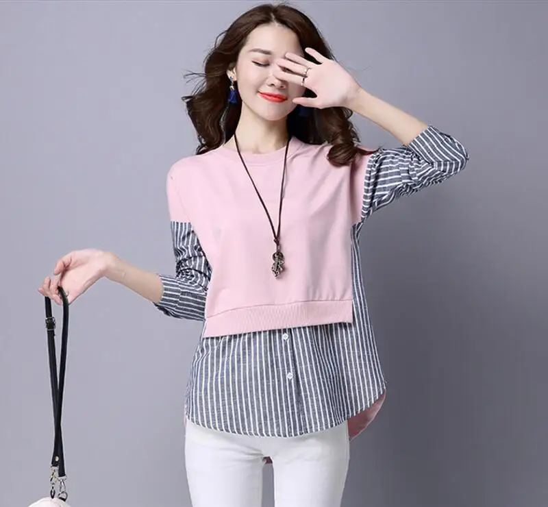 2018 Autumn Striped Patchwork Hoodies Women Clothing Long Sleeve Fake Two Pieces Pullovers Casual Tracksuit Female Sweatshirt