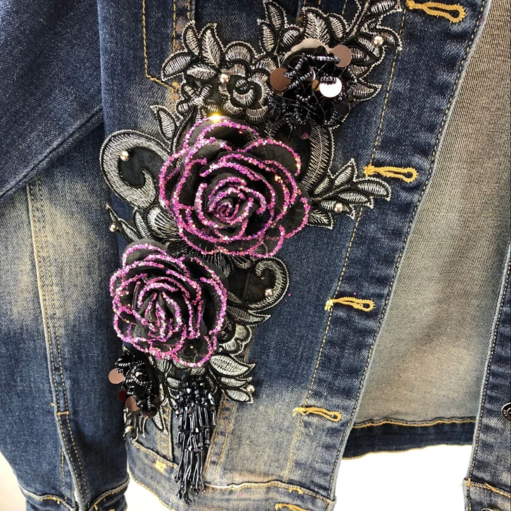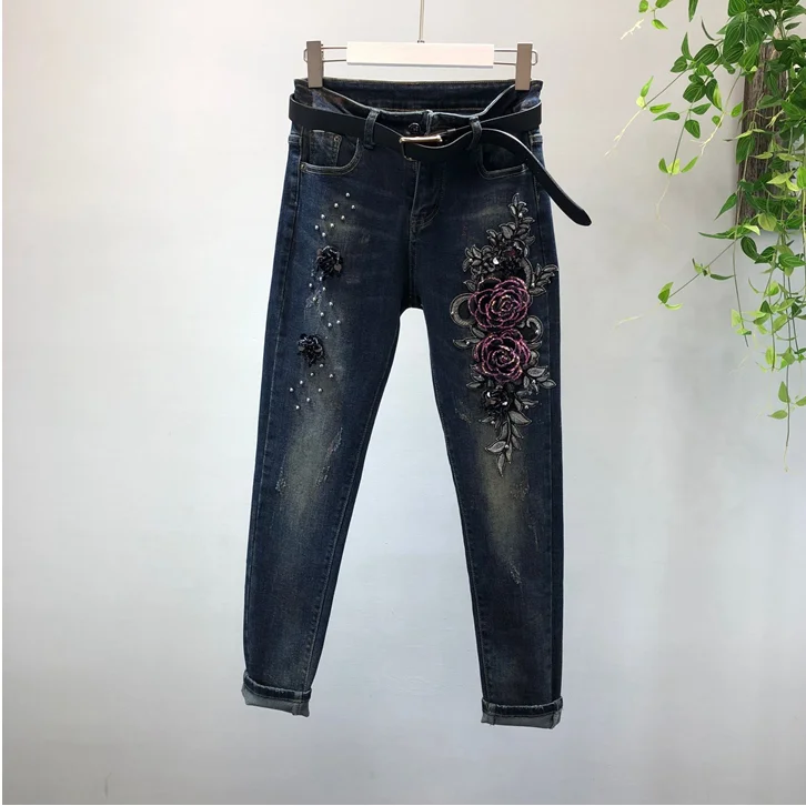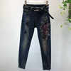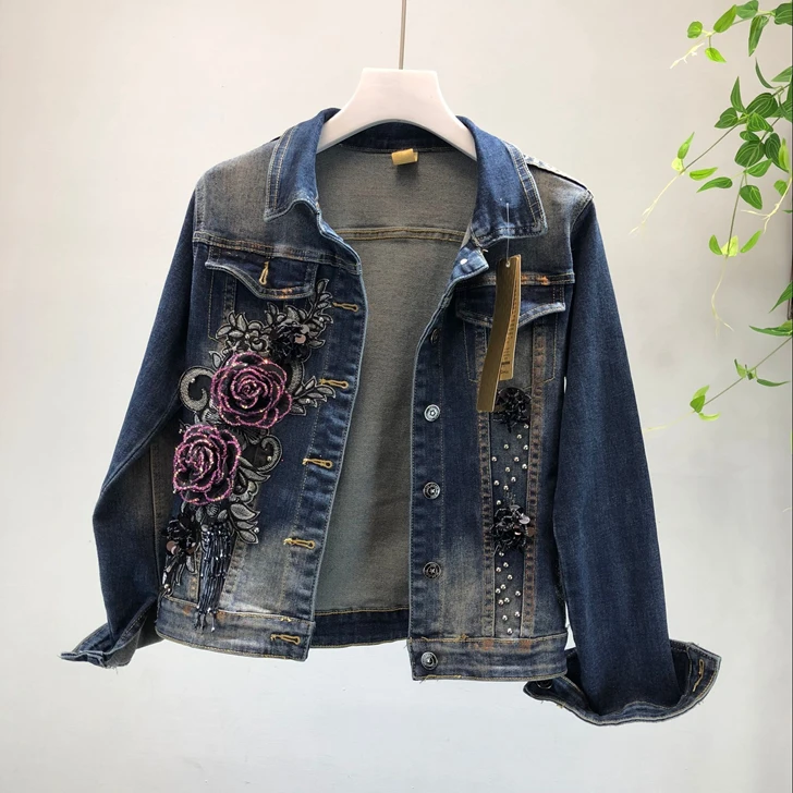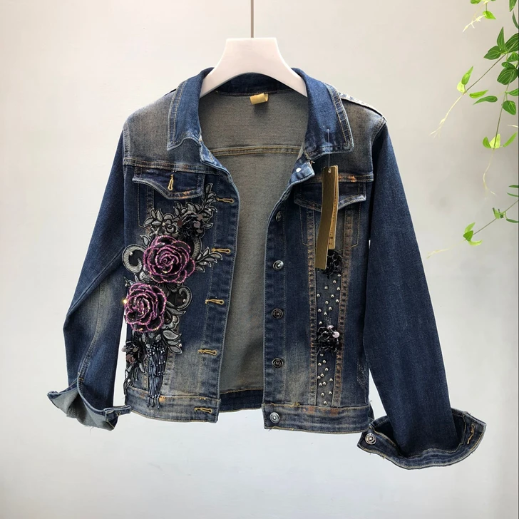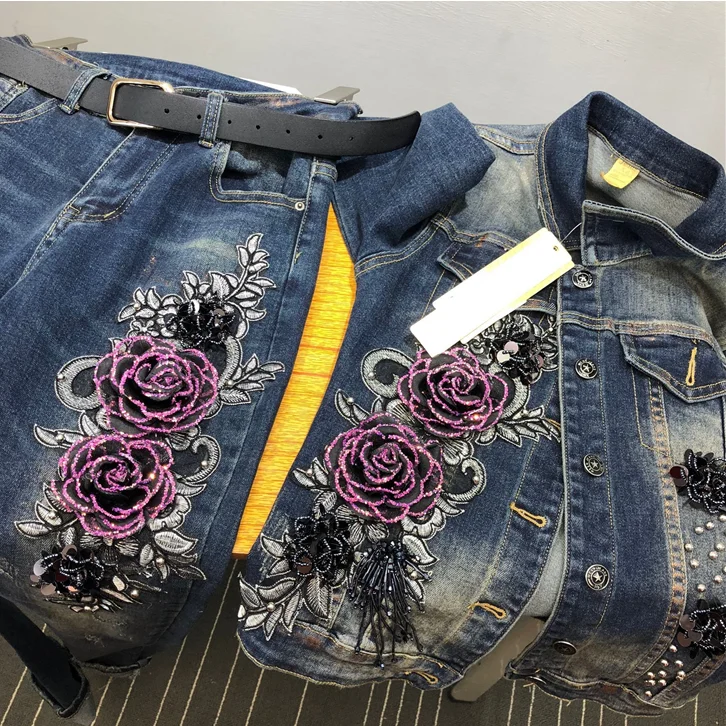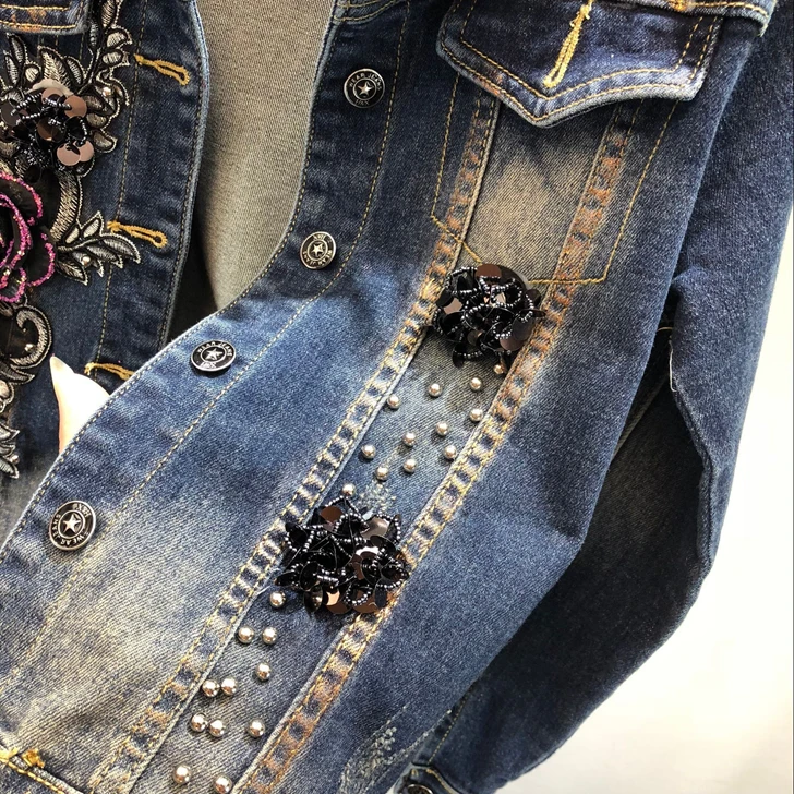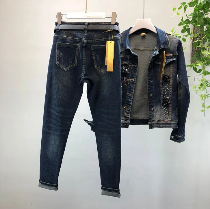 2018 Autumn Winter Woman Long-sleeved Denim Jackets Embroidered Coat + Dark Blue Retro Jeans Two Piece Slim Pencel Pants Set