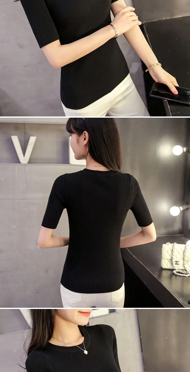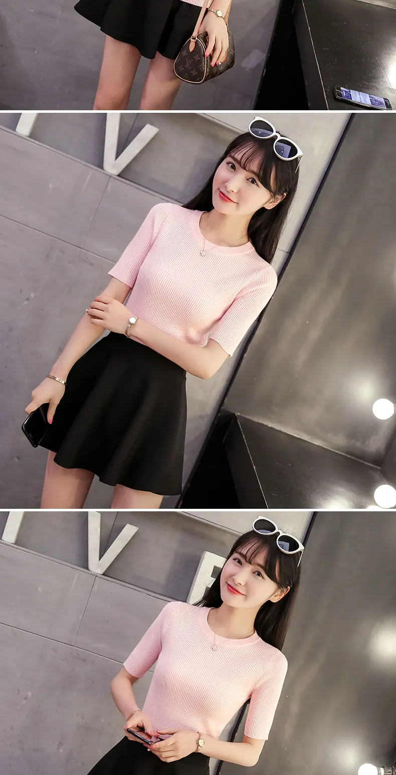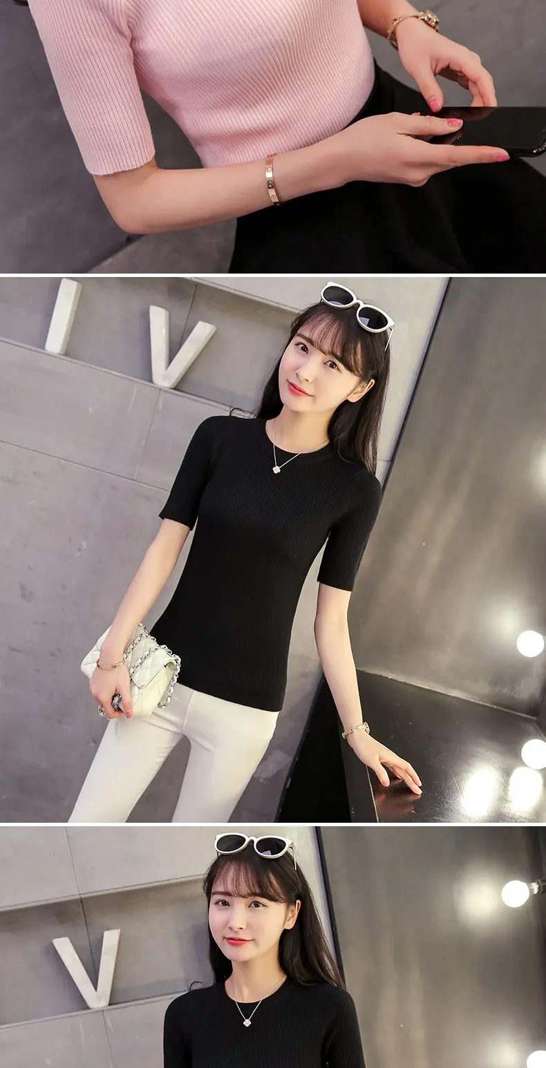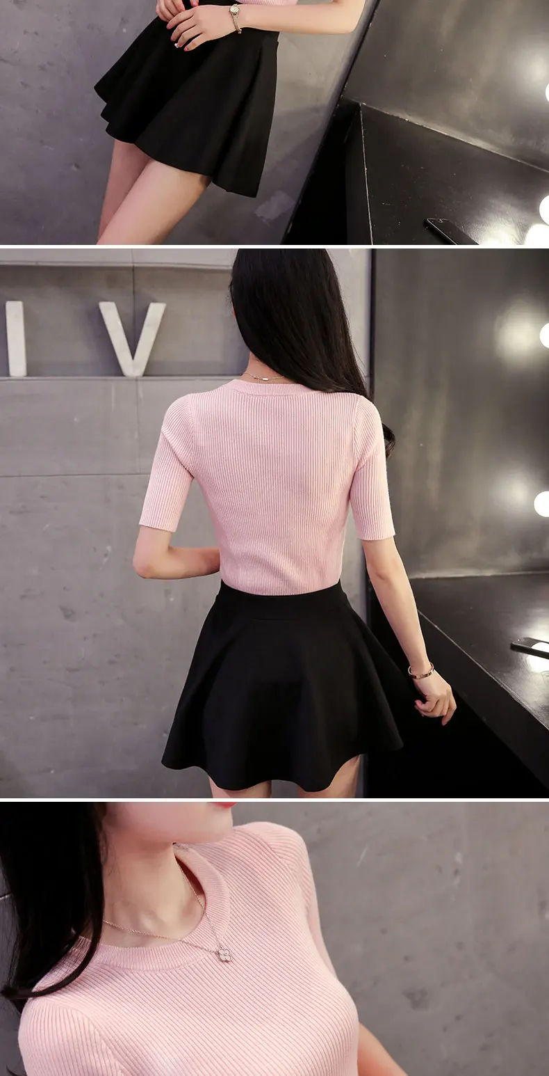 2018 Cotton Crewneck sweater female summer slim blouse color short thin sweater tight shirt