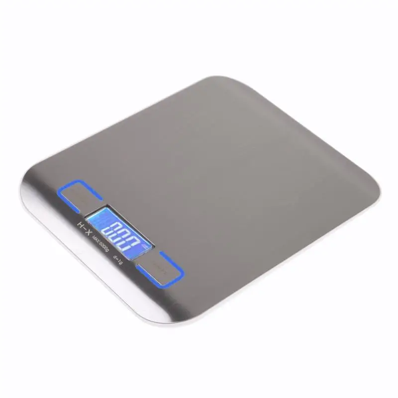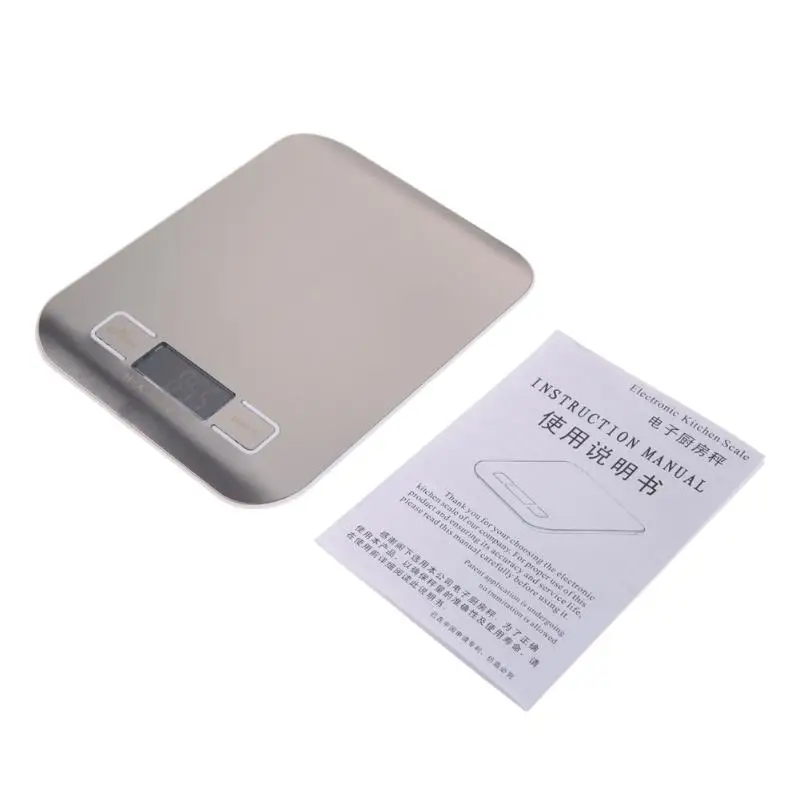 This is an ultra slim digital kitchen scale with sleek stainless steel weighing surface. High-precision sensor Weighing range of 5000g/1g 3000g/1g Division value 1g LCD display with negative white digital Automatic zero point tracking Automatic turn-off Overload prompt Unit-conversion switch(g/ozt/1b’oz) Easy to clean stainless steel weighing surface This item operates with two AAA batteries, which are NOT included. Specifications: