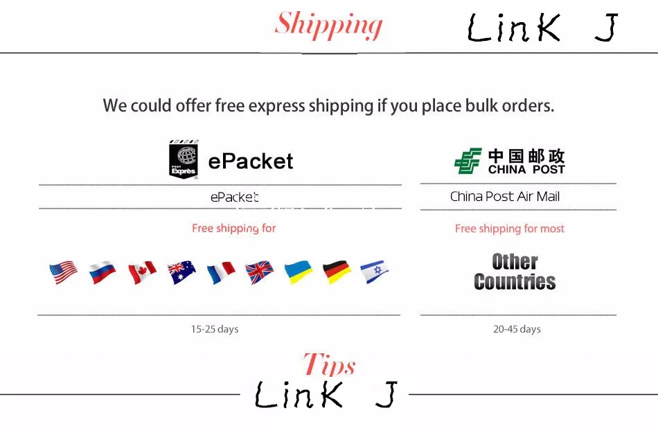 Packages from our warehouse in China will be shipped by ePacket or EMS depending on the weight and size of the product. Packages shipped from our US warehouse are shipped through USPS.