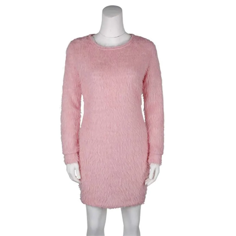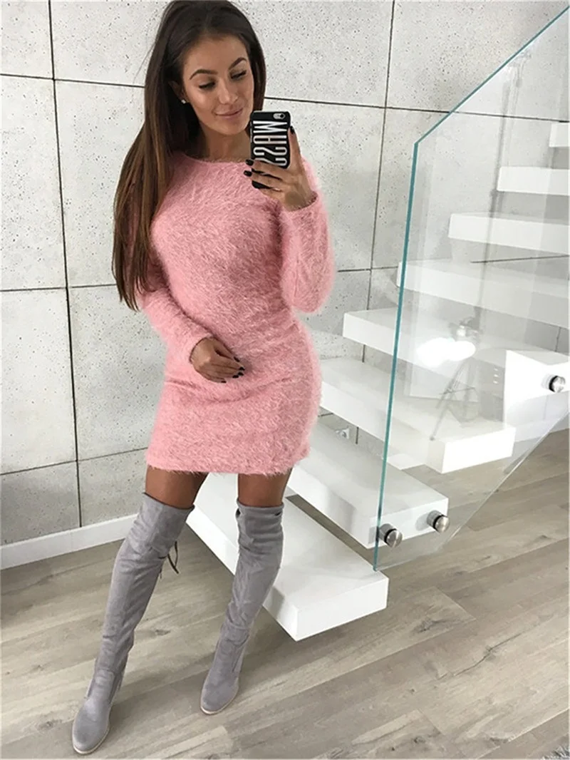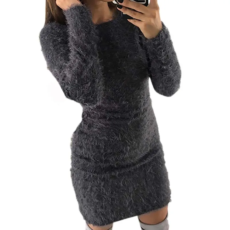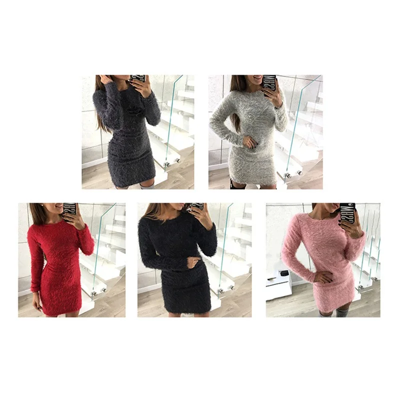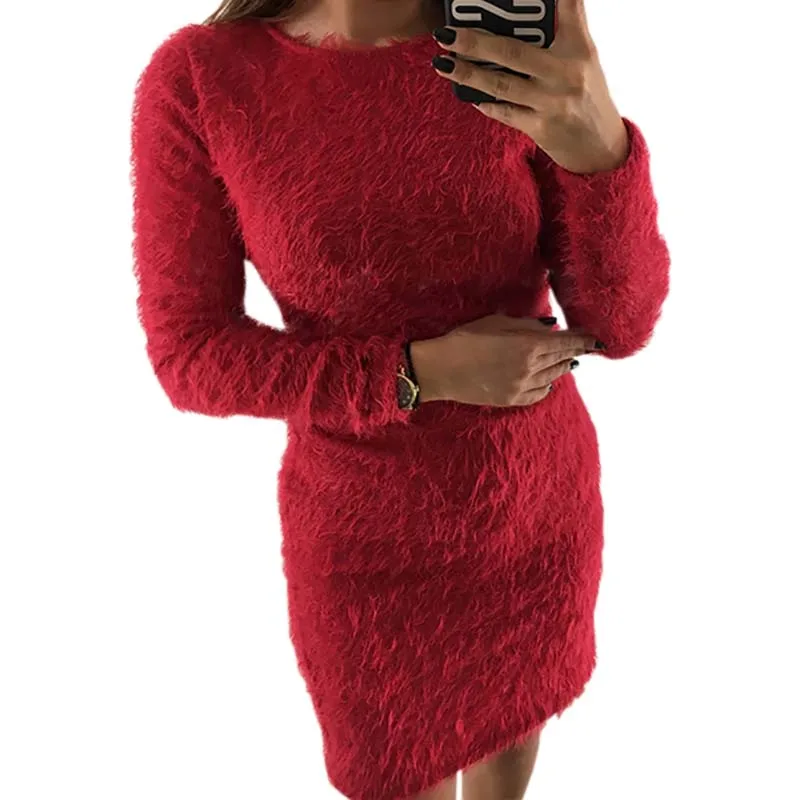 2018 Fashion Plush Sweater Dress Women Party Night Bodycon Dresses Autumn Winter Red Clothing Casual Sexy Mini Knitted Sweater