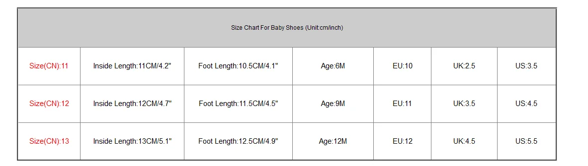 Size(CN):11 Inside Length:11CM/4.2″ Foot Length:10.5CM/4.1″ Age:6M EU:10 UK:2.5 US:3.5