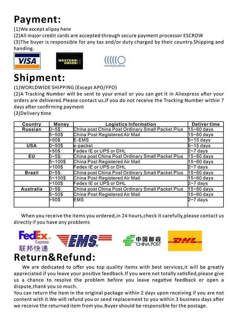 • If you did not receive the product within the guaranteed time( 45 days not including 2-5 day processing) you can request a refund or a reshipment.