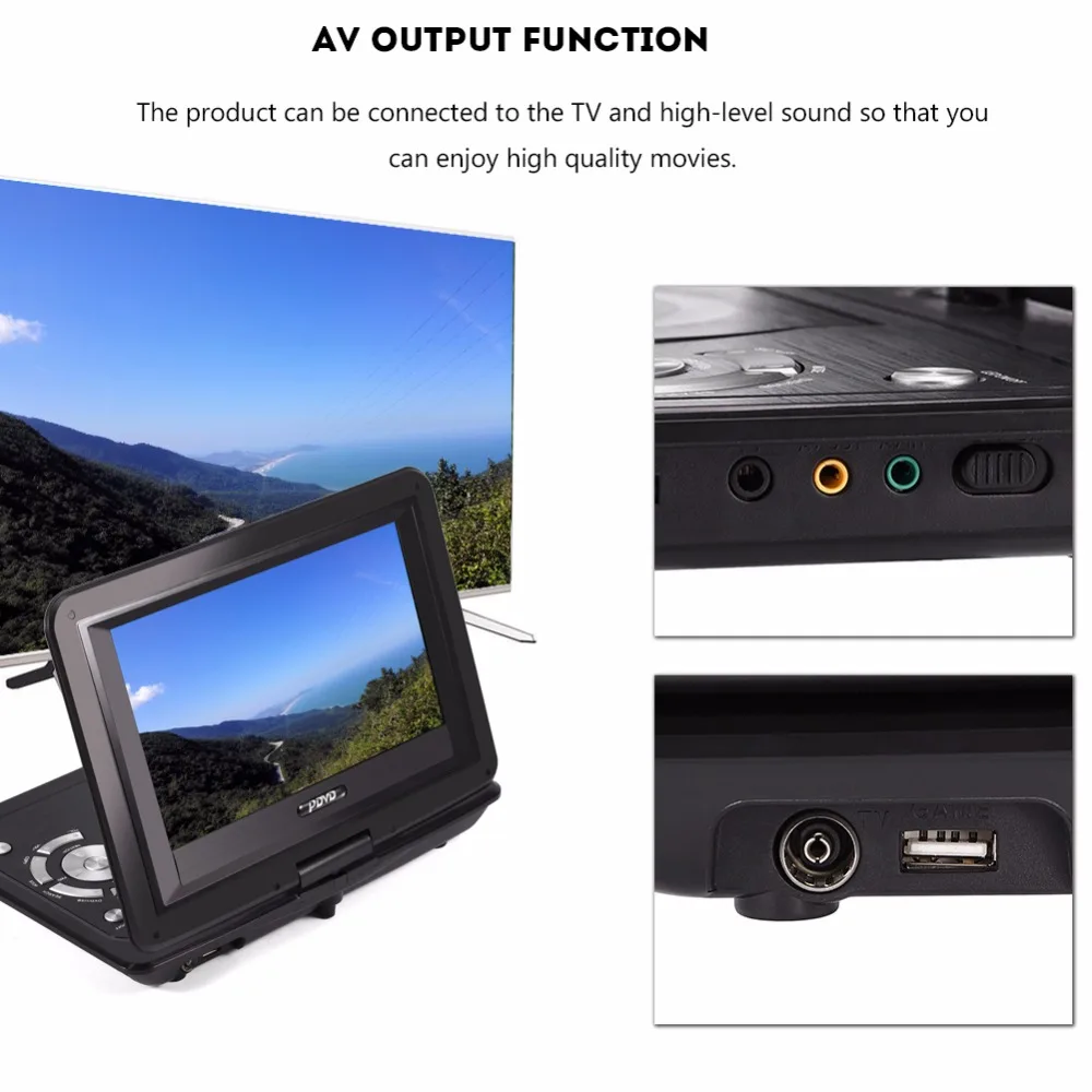 This DVD player is a high definition and high-quality broadcast equipment. It is a multi-functional combination of DVD player, TV player, FM radio receiver, memory card reading, playing games, and so on. Equipped with rechargeable lithium battery for long working, fully suitable for home, office, vehicle and other occasions.