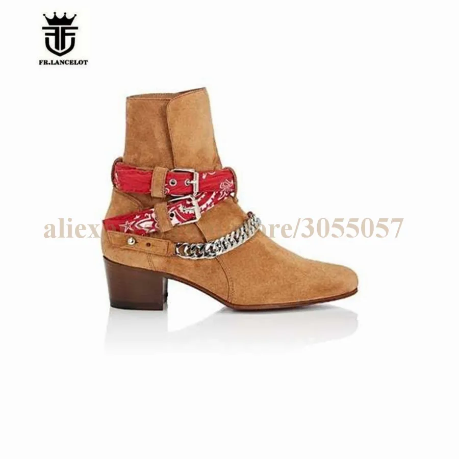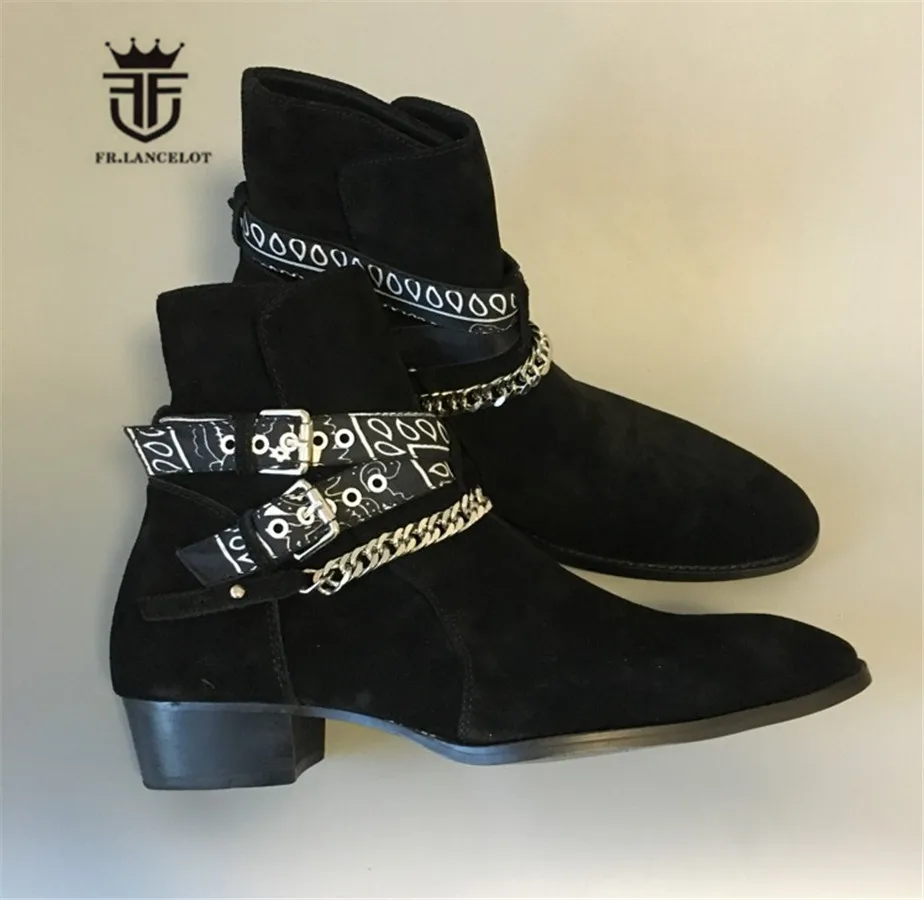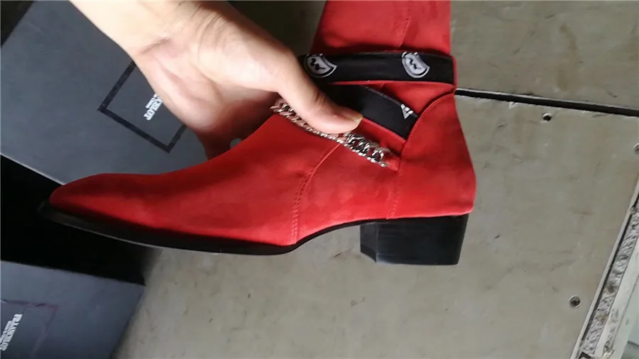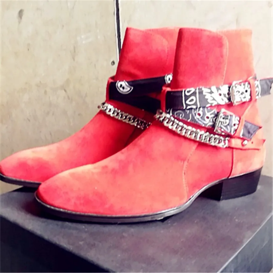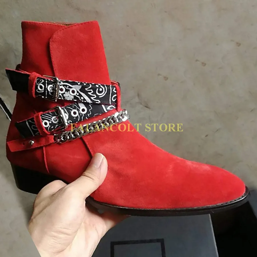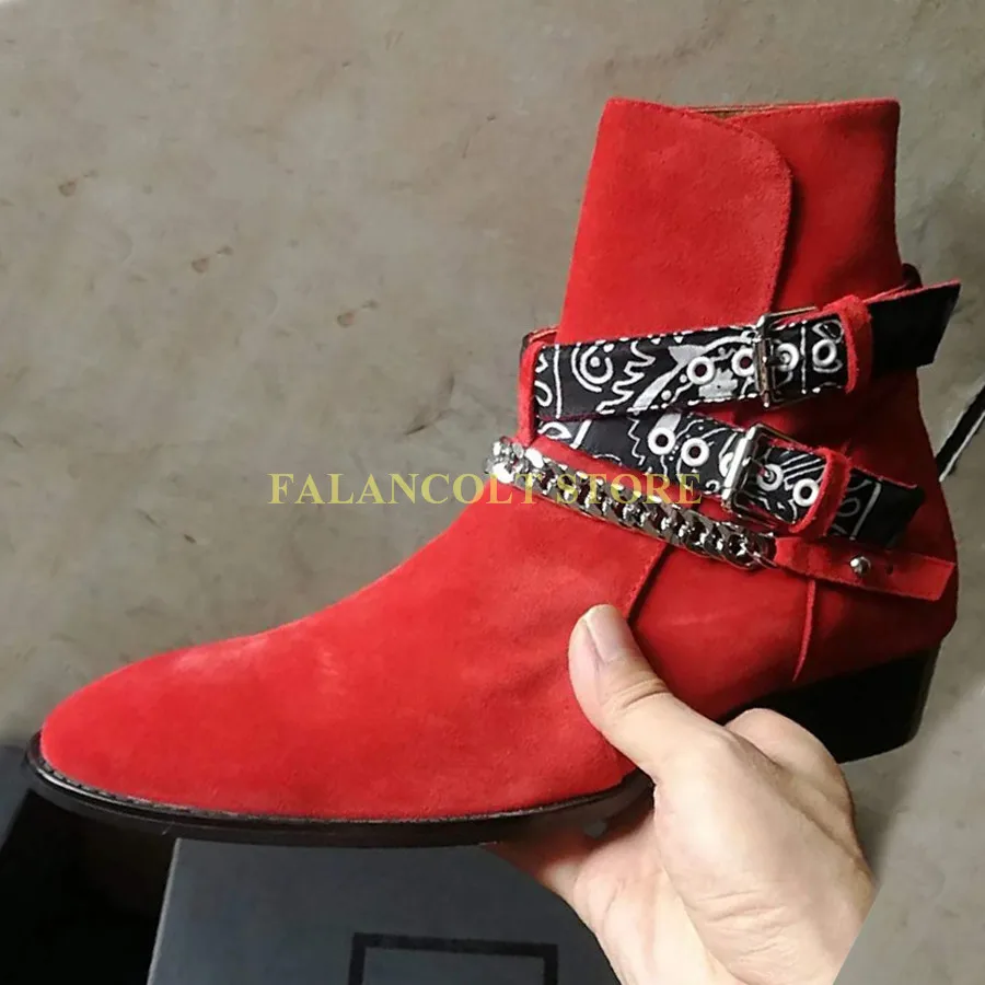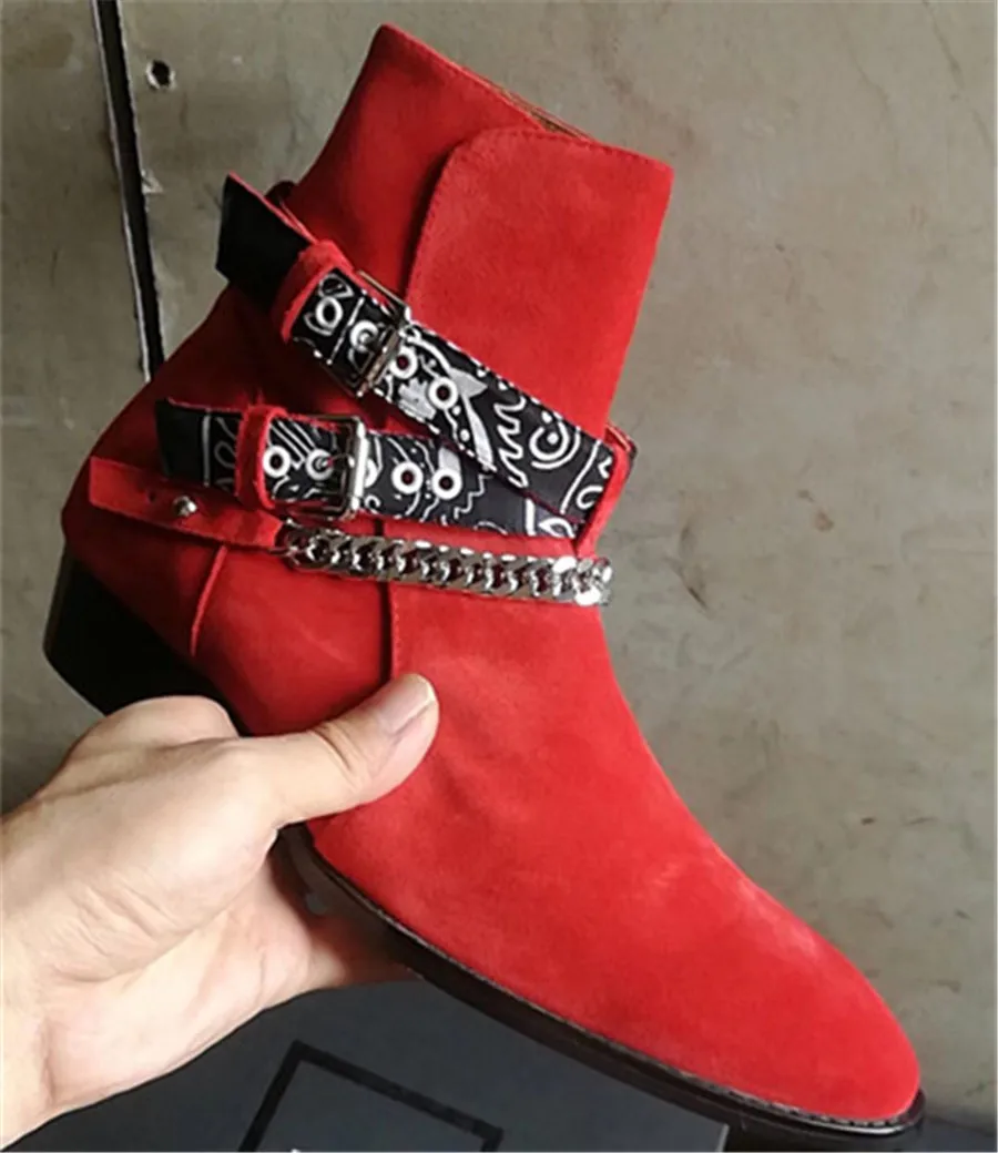 2018 High End Exclusive Chain Buckle Strap Graffiti Cloth Sexy Boots Red Suede Catwalk T show Luxury Men Boots