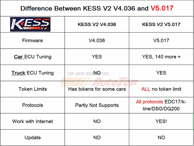 1. KESS V4.036 only supports car, KESS V5.017 can support car/truck/tractor/Bike !