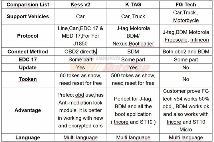 KESS V5.017 can support some truck/tractor/motorcycle, But KTAG V7.020 can support much more truck/tractor/motorcycle and works better for Diesel vehicles than KESS V5.017 !