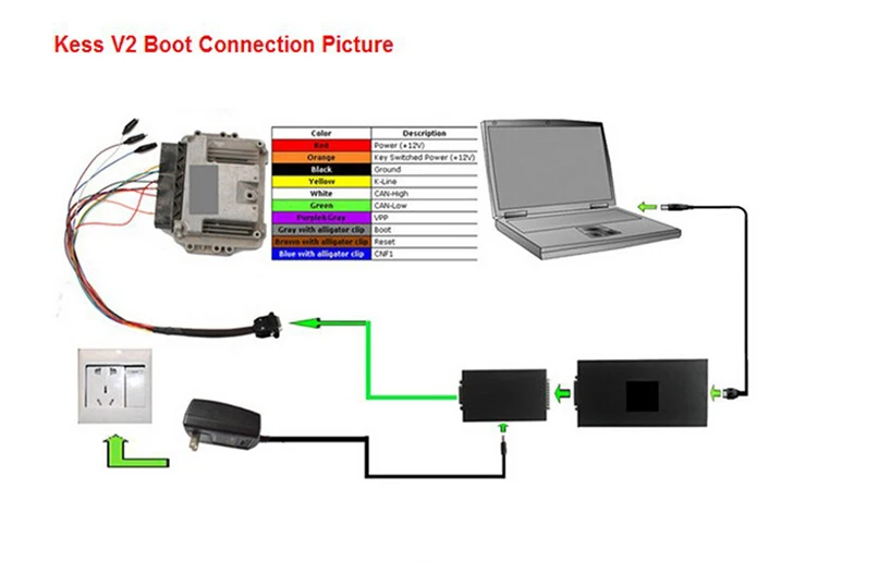 A: If your car is OBD diagnostic socket, just plug the OBD cable into the car; if your car is not OBD diagnostic socket, after you select the ECU type in the KESS V2 software, the diagram will appear and show you how to connect (see the following pictures)