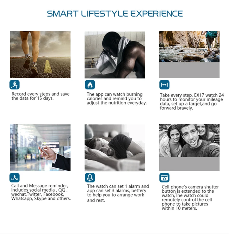 2.Step counting, sports management, calories, sports distance, calendar, remote photo, phone SMS notification; WeChat, QQ FACEBOOK, etc. Third-party information reminder Full-time display, stopwatch, alarm clock,