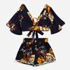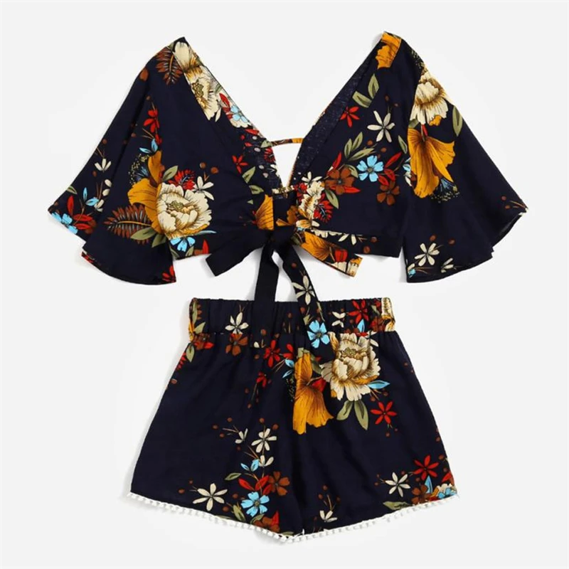 2018 New Fashion Summer Spring Casual Two Piece Set Women Botanical Print Summer V Collar Top Shorts Beachwear Bohemian
