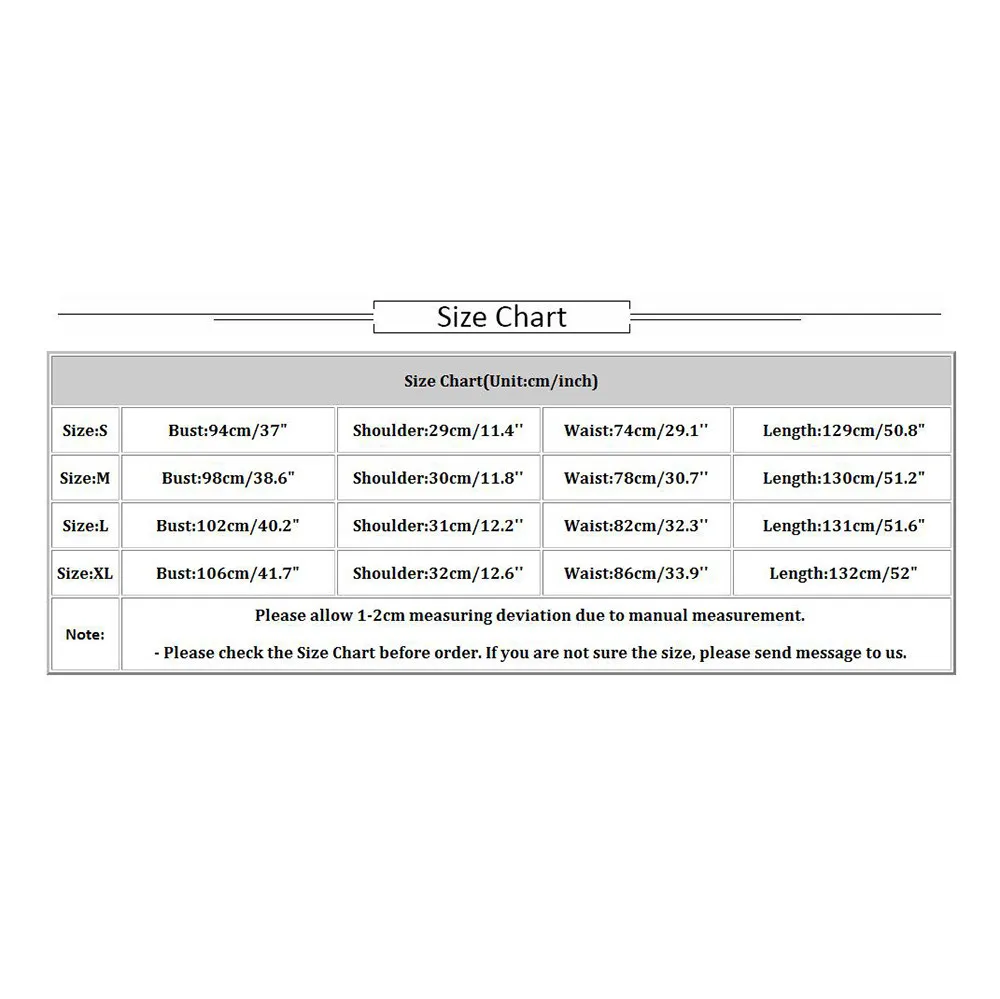 Size:L Bust:102cm/40.2″ Shoulder:31cm/12.2” Waist:82cm/32.3” Length:131cm/51.6″