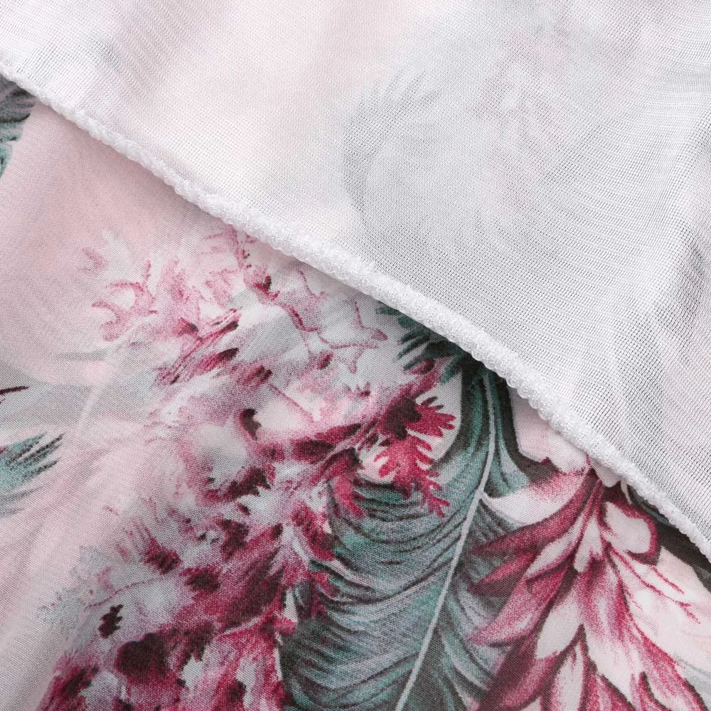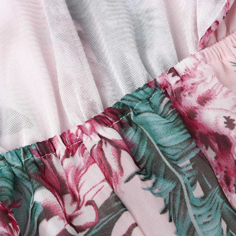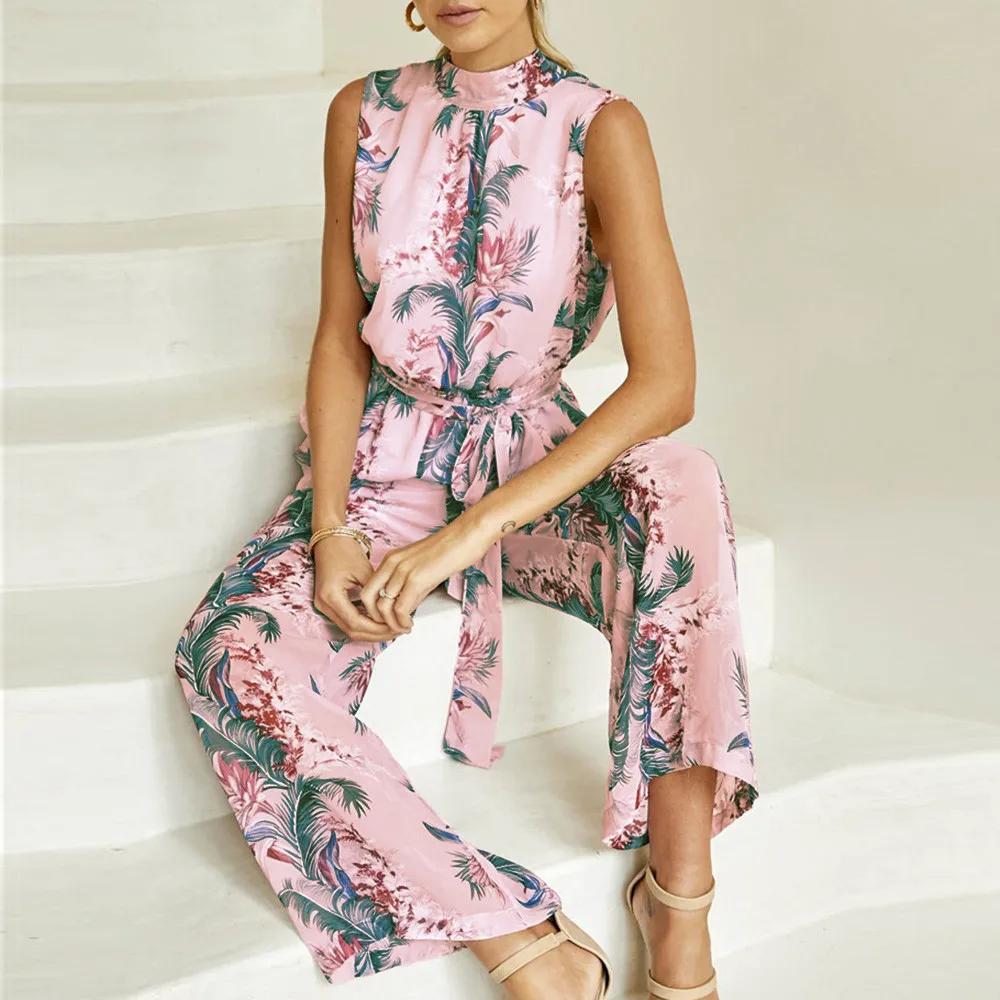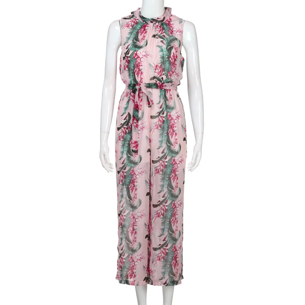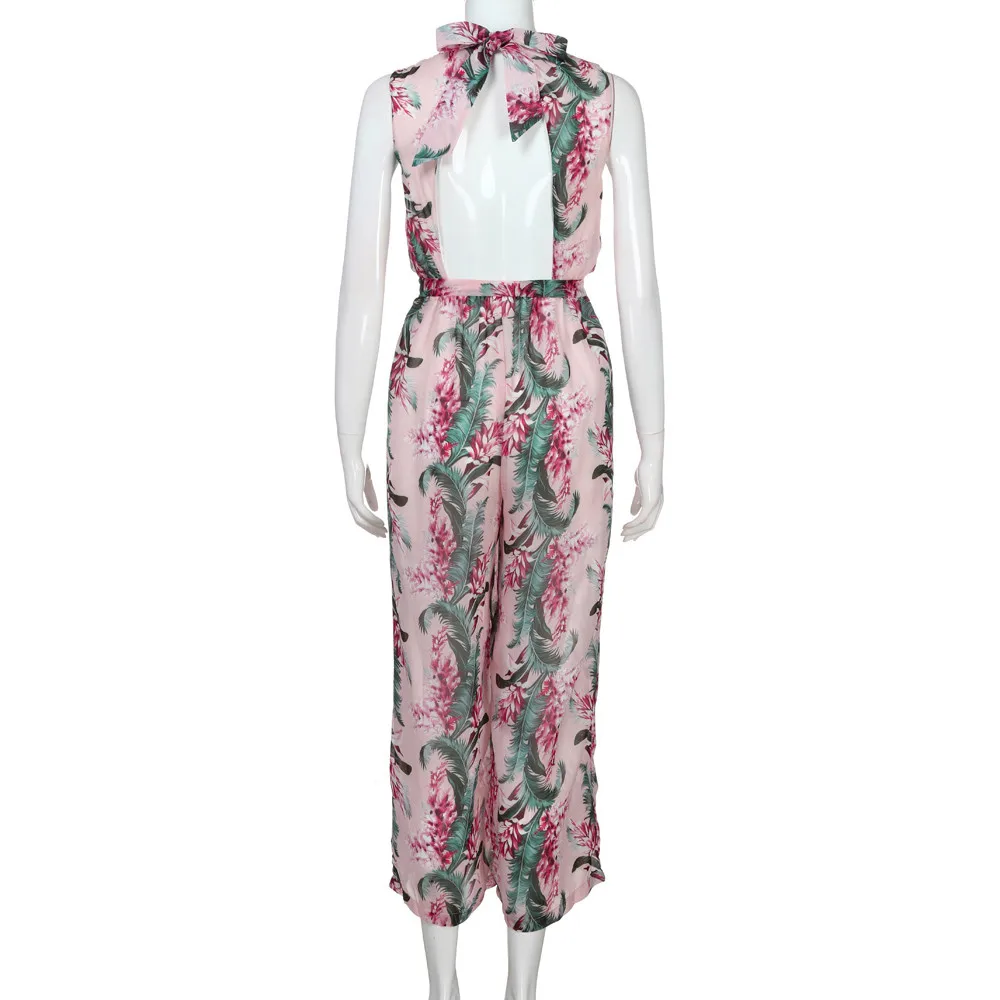 2018 New Fashion Summer Women Pink sexy Chiffon Floral Printed Backless Bandage Wide Leg Pants Sleeveless Playsuit body feminino
