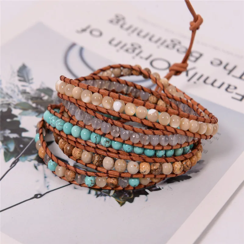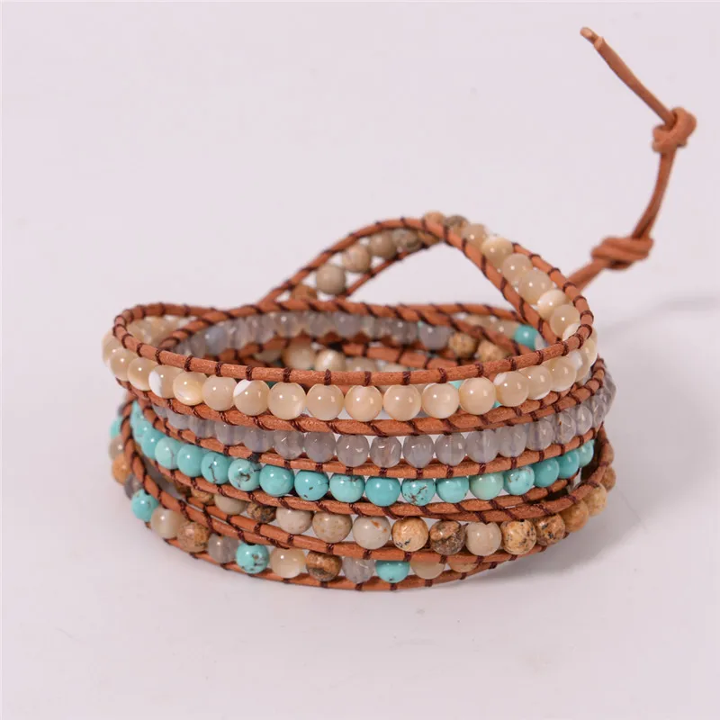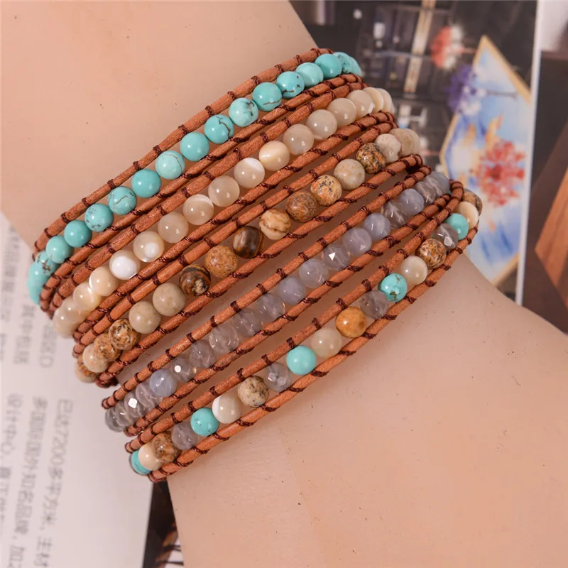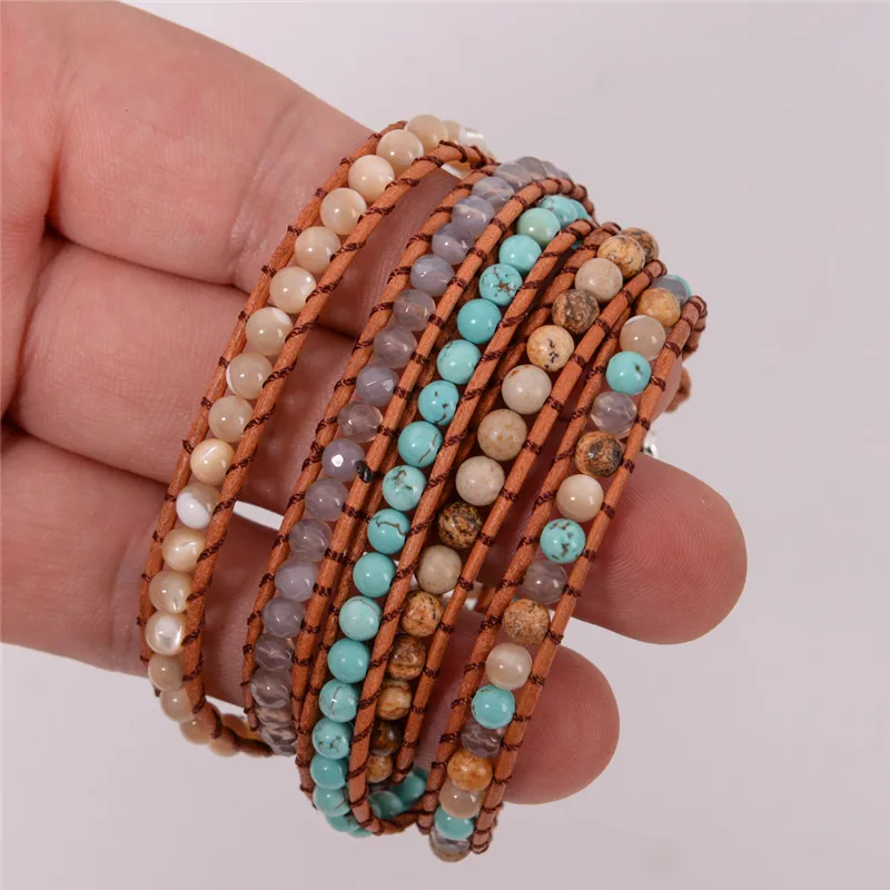 Fashion Jewelry 5 Strands 4mm Natural Stone Bead Handmade Leather Bracelet Wrap Bracelet HandWork Drop Shipping
