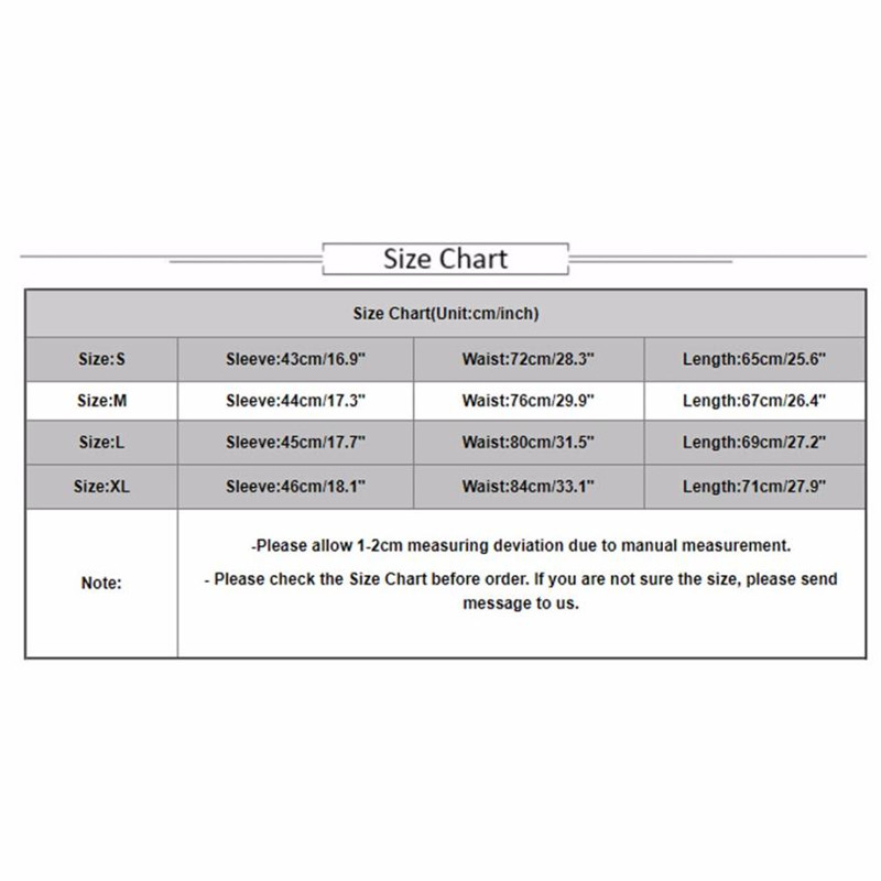 Size:XL Sleeve:46cm/18.1″ Waist:84cm/33.1″ Length:71cm/27.9″