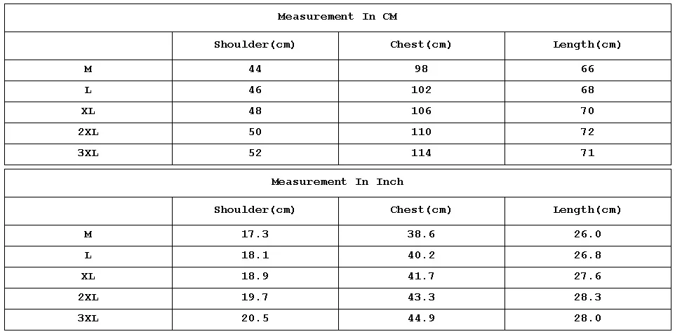 3: If you are not sure of your size, please let us know your shoulder and chest or height and weight, we can help you choose the more suitable clothes, but you should decide the size finally