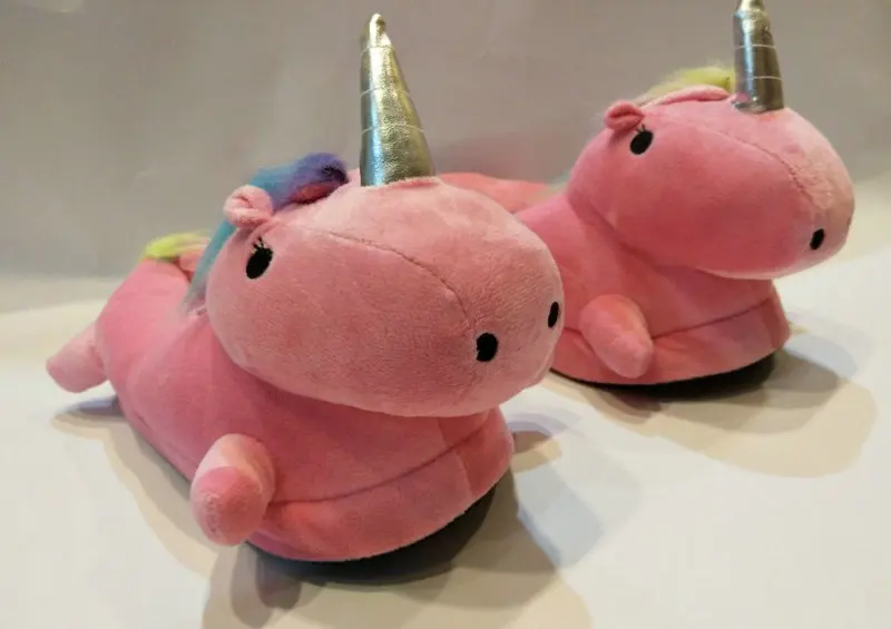 The lovely unicorn slippers have golden horns and rainbow hair and lights